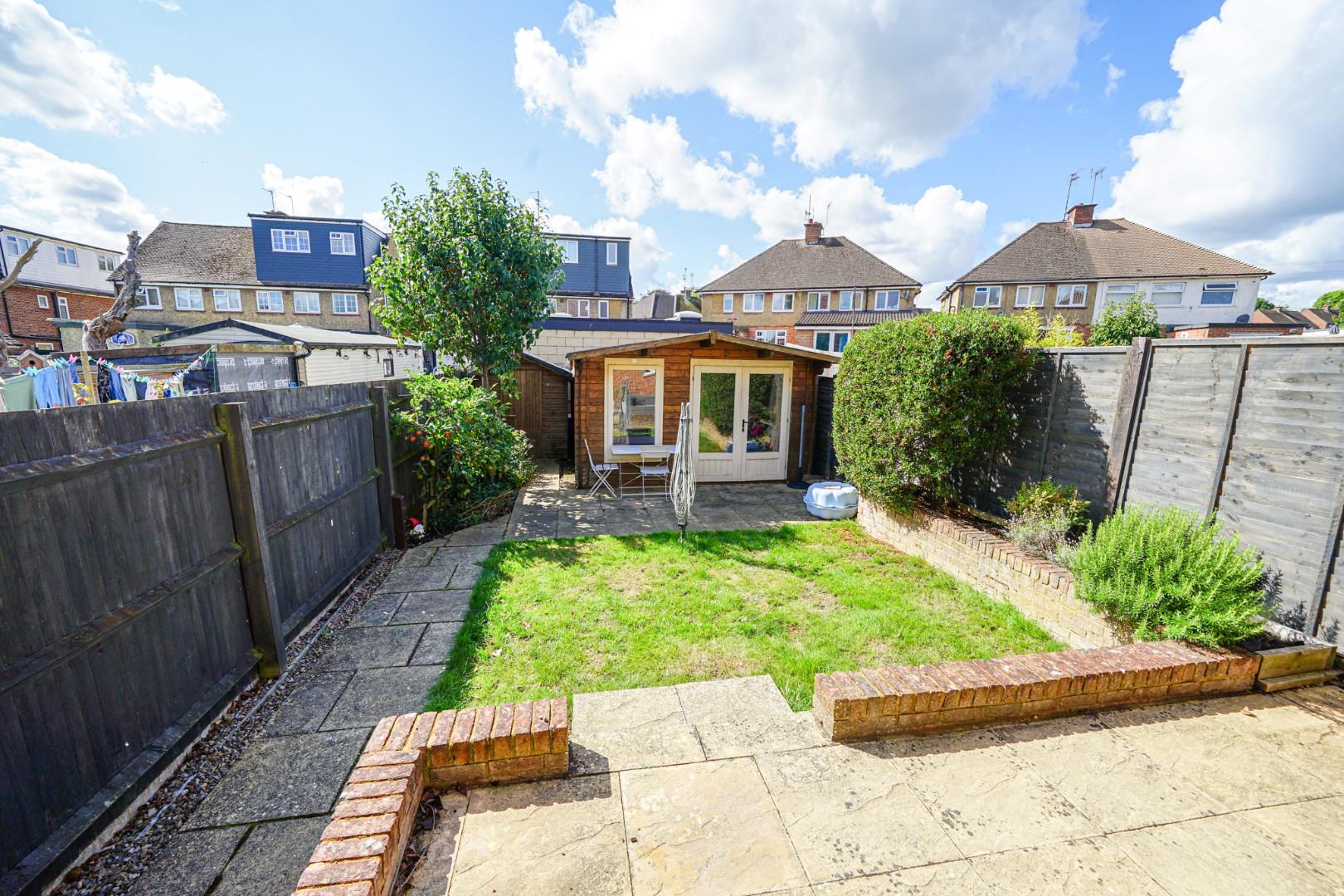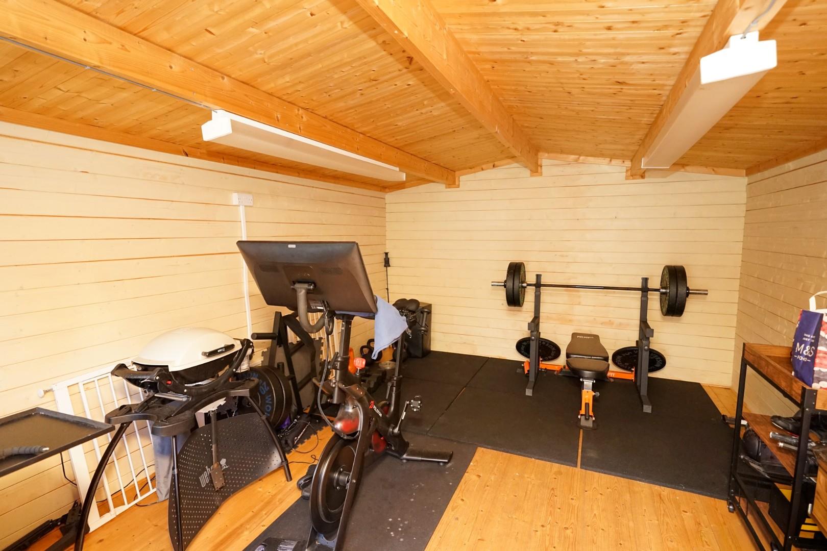 To the front, a neat artificial lawn with pathway leads to the front door, with side gated access to the rear. The rear garden has been thoughtfully landscaped, with a raised patio directly outside the kitchen/dining room, steps leading down to a central lawn with raised beds, and a further patio area providing an additional seating spot. A timber shed offers storage, while the impressive summer house sits at the end of the garden. Fully supplied with power and lighting, it is currently arranged as a home gym but is equally well-suited for use as a home office, studio or leisure room. Additionally, the property benefits from two allocated parking spaces.