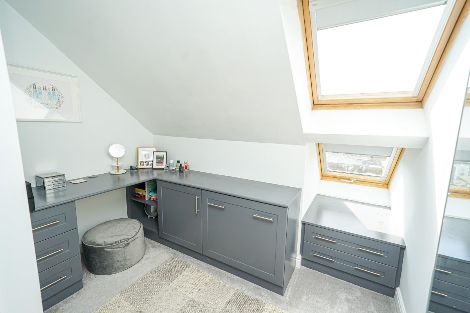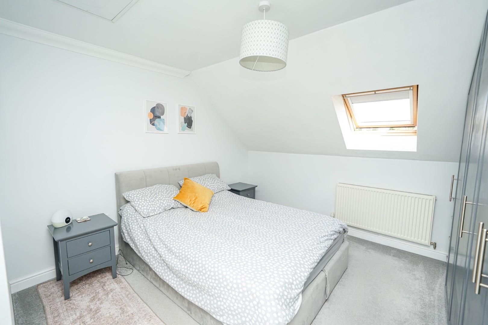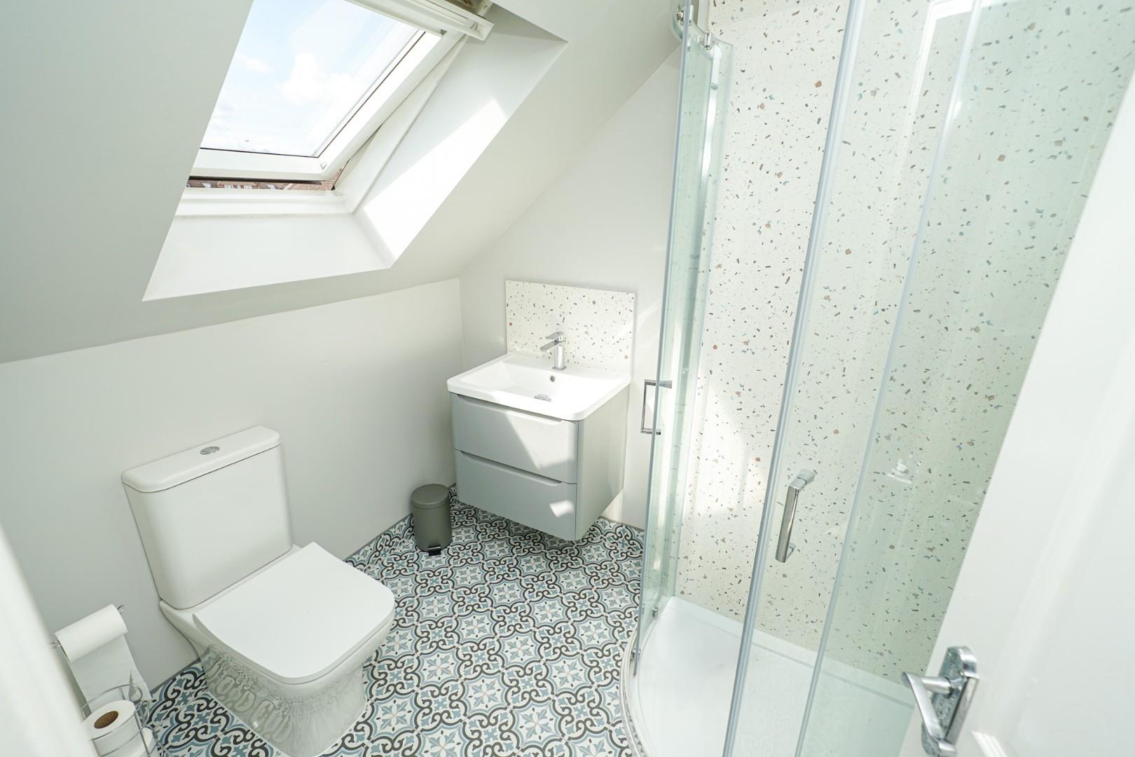 The master suite is an impressive retreat, spanning the entire top floor. The room provides excellent proportions, with space for a bed and additional furniture, fitted wardrobes along one wall and a dressing area to the rear. Three Velux windows bathe the room in natural light. An ensuite shower room completes the suite, comprising low level WC, vanity wash hand basin and shower cubicle.