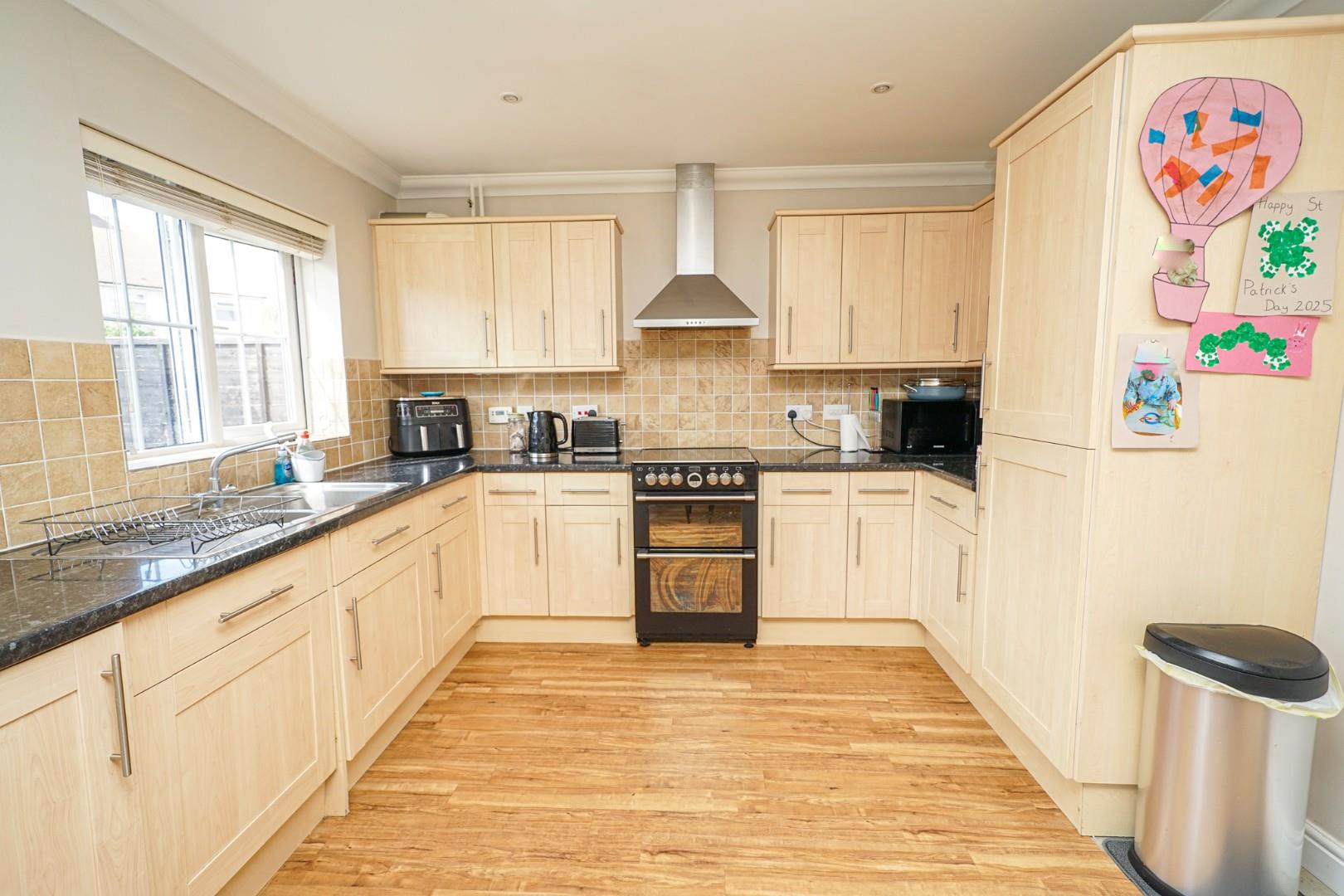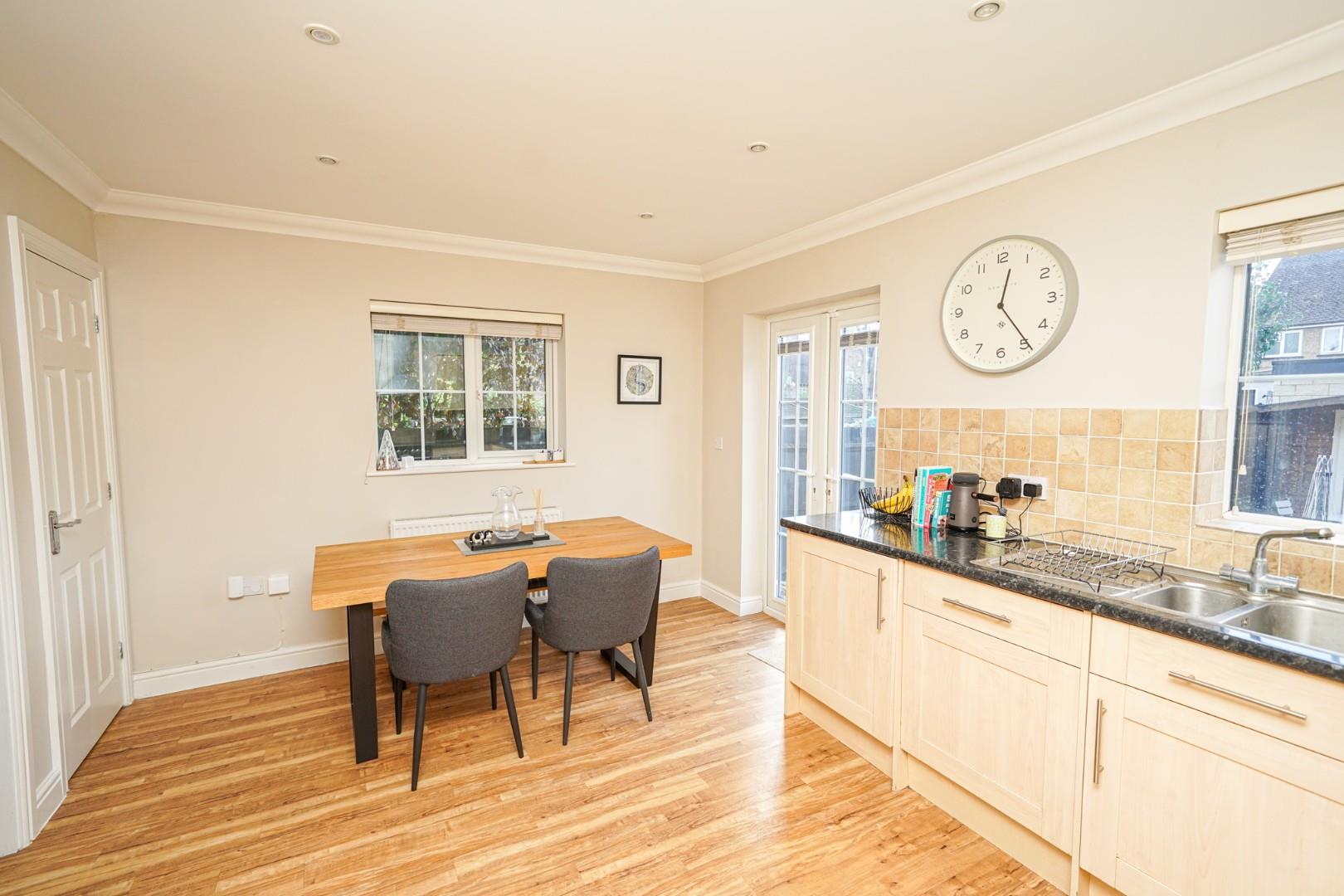 A welcoming hallway greets you on arrival, with stairs to the first floor and access to a cloakroom/WC. To the front, the well-proportioned lounge provides a comfortable and inviting living space, complete with a built-in understairs cupboard. Wood effect flooring flows through to the kitchen/dining room, which spans the width of the property at the rear. The kitchen is fitted with a range of wall and base level units with integrated appliances including a washing machine, dishwasher and fridge freezer, along with space for a cooker with extractor hood over. The dining area accommodates a family-sized table with ease, while French doors open directly onto the raised patio, creating a seamless indoor/outdoor entertaining space.
