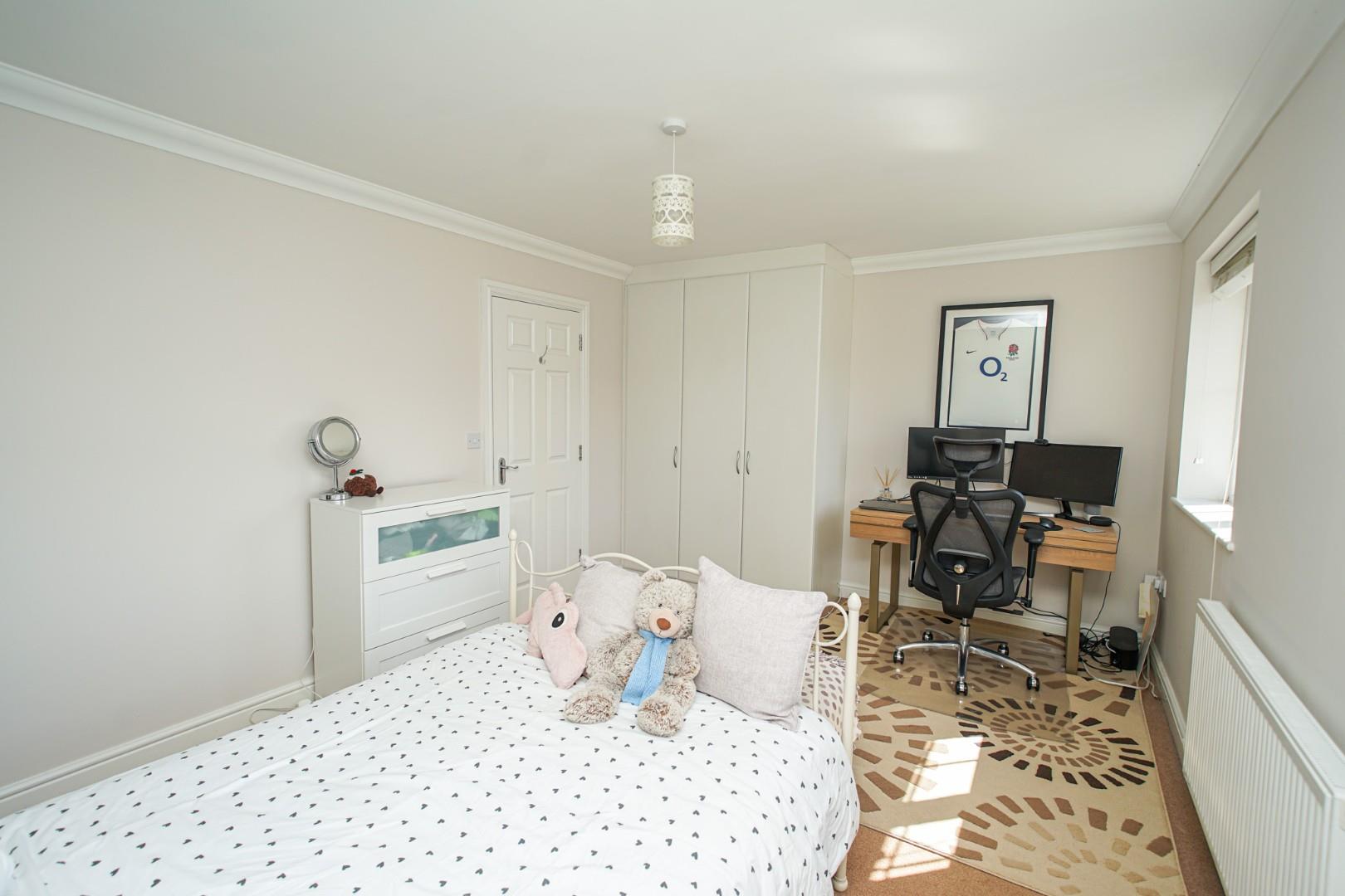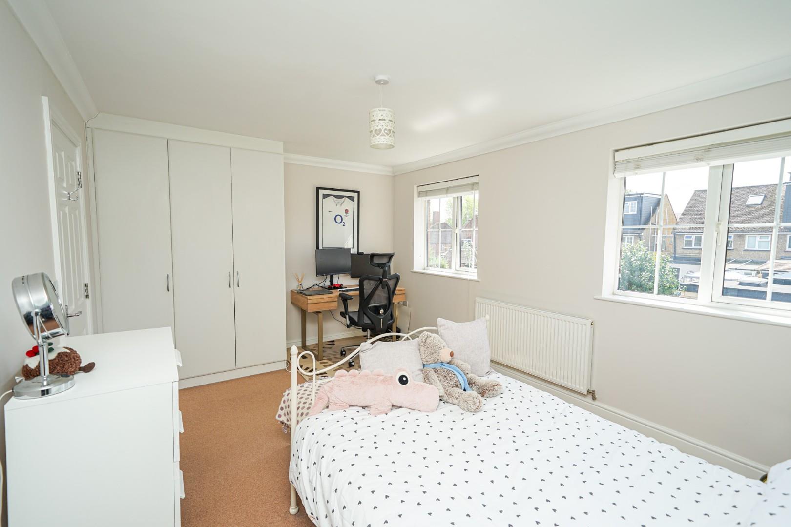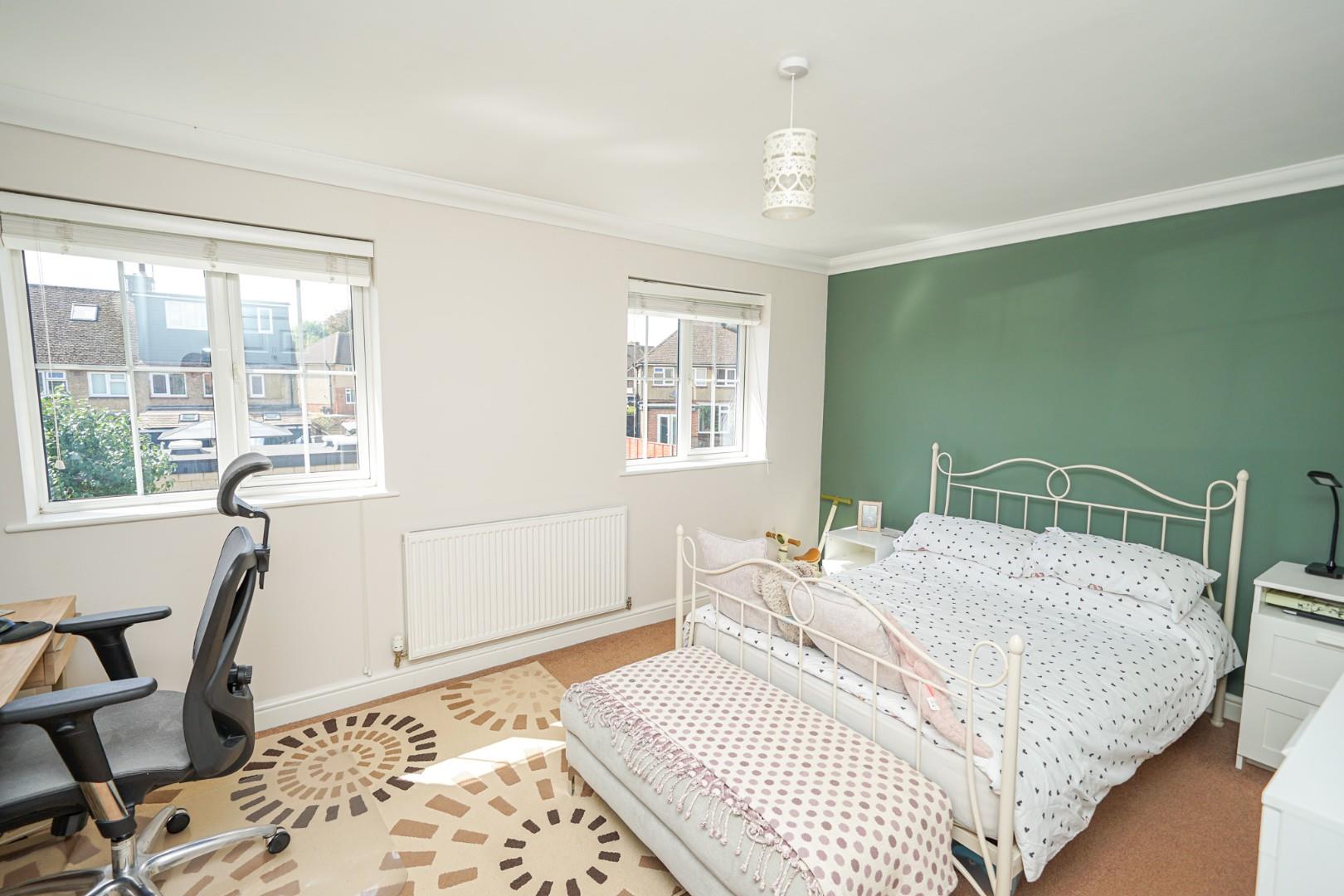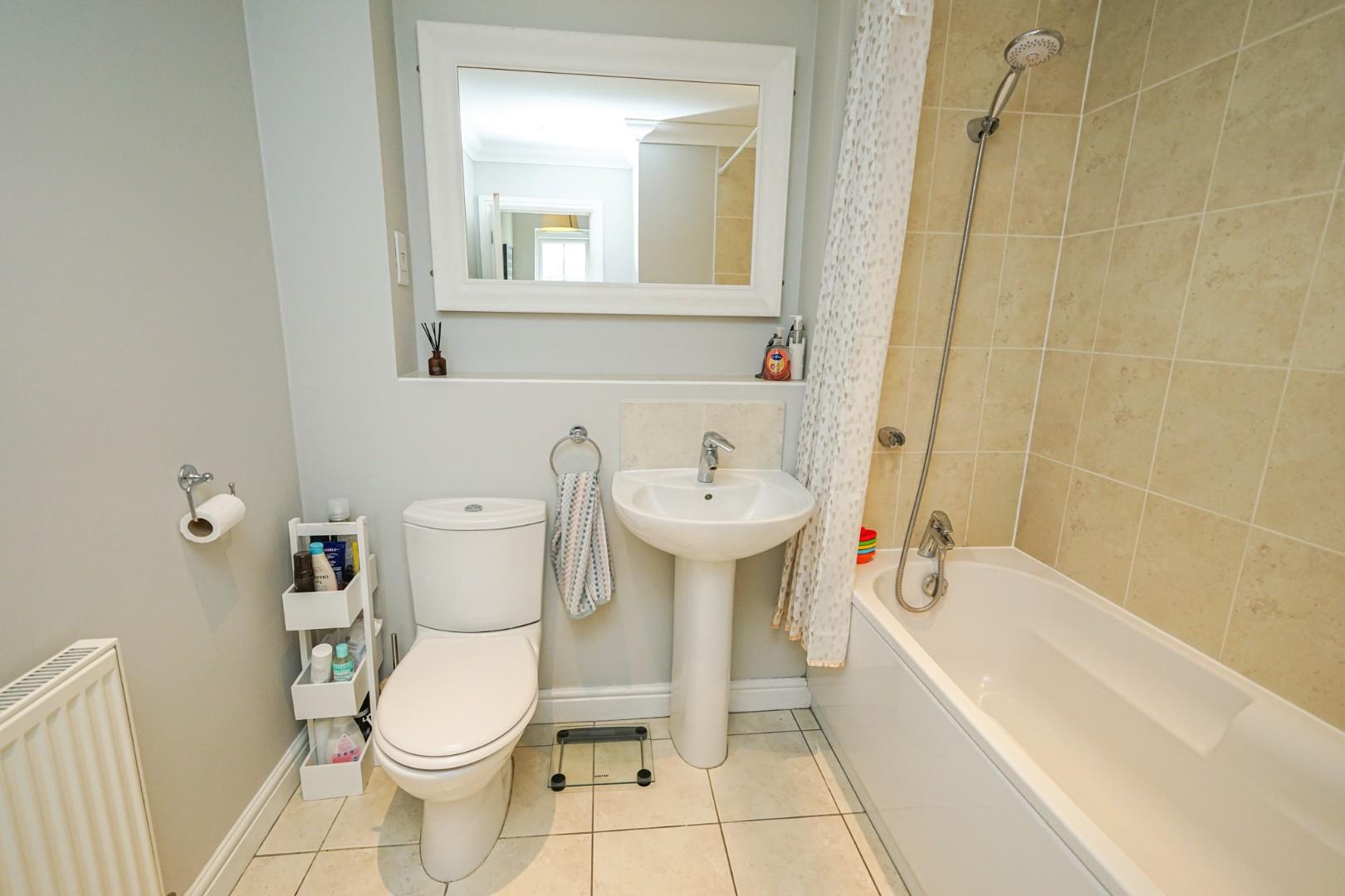 The central landing serves two generous bedrooms and the family bathroom, while also offering space for a study area, ideal for working from home. The rear bedroom spans the full width of the property and is a generous double, while the front bedroom is also well proportioned. The family bathroom sits between the two and is fitted with a modern three piece suite comprising a low level WC, pedestal wash hand basin and panel bath with shower attachment.