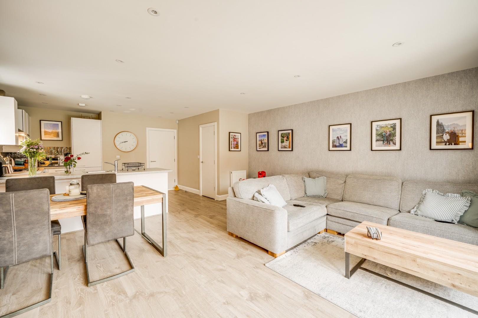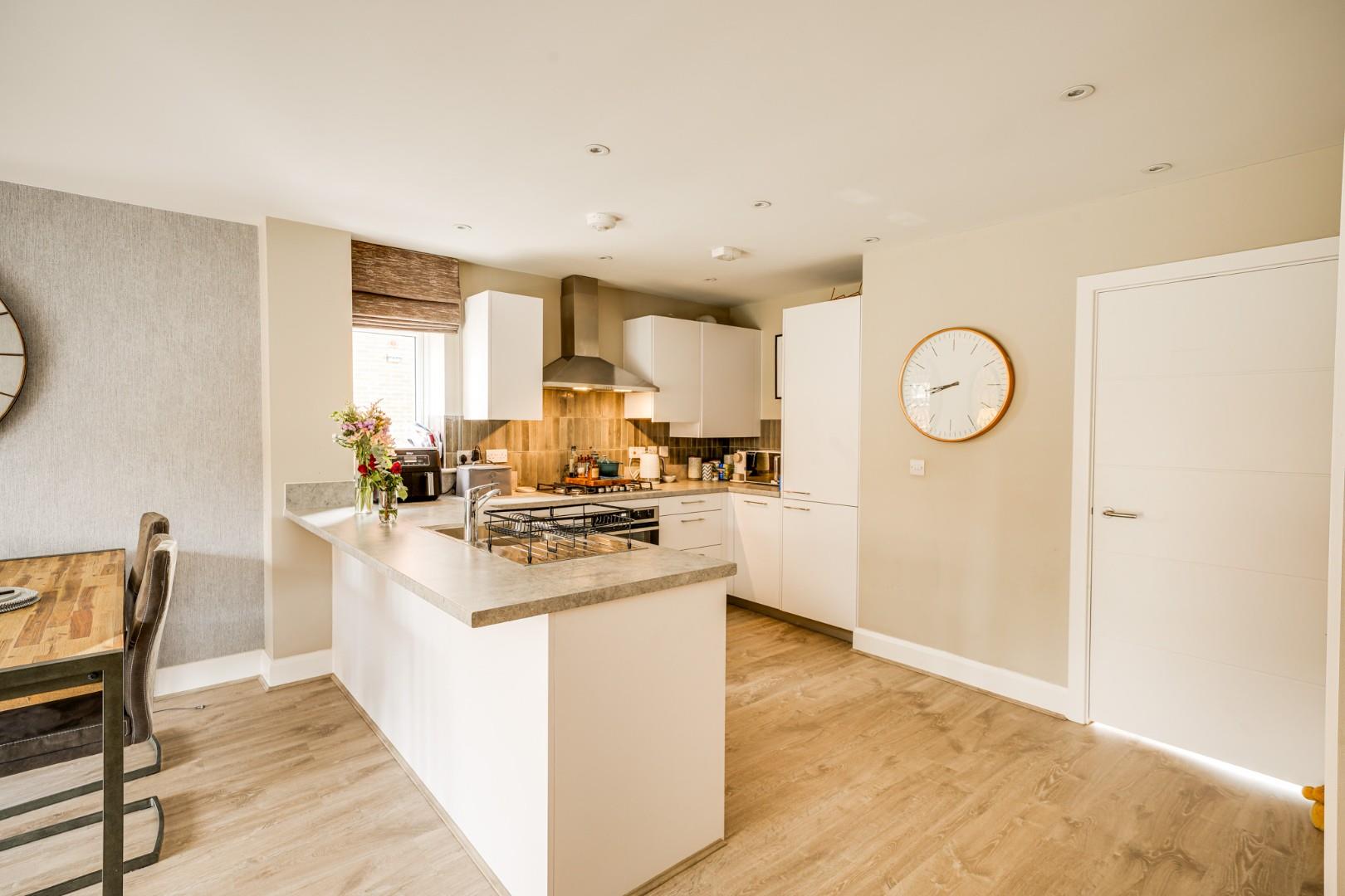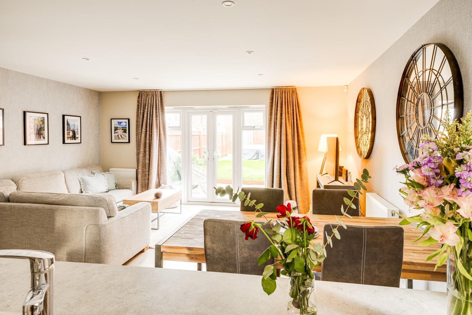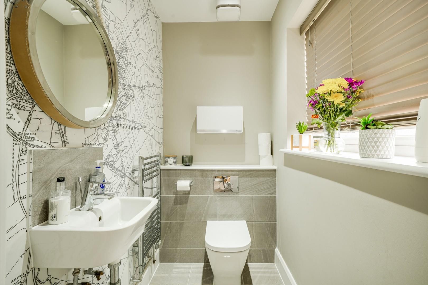 To the rear of the property sits the kitchen/dining room, forming the social heart of the home. Fitted with a range of modern wall and base level units along with integrated appliances and generous work surface space, the kitchen flows naturally into a dining area with room for a family-sized table. Doors open directly onto the rear garden, creating a seamless indoor-outdoor connection during the warmer months. A cloakroom/WC completes the ground floor accommodation.