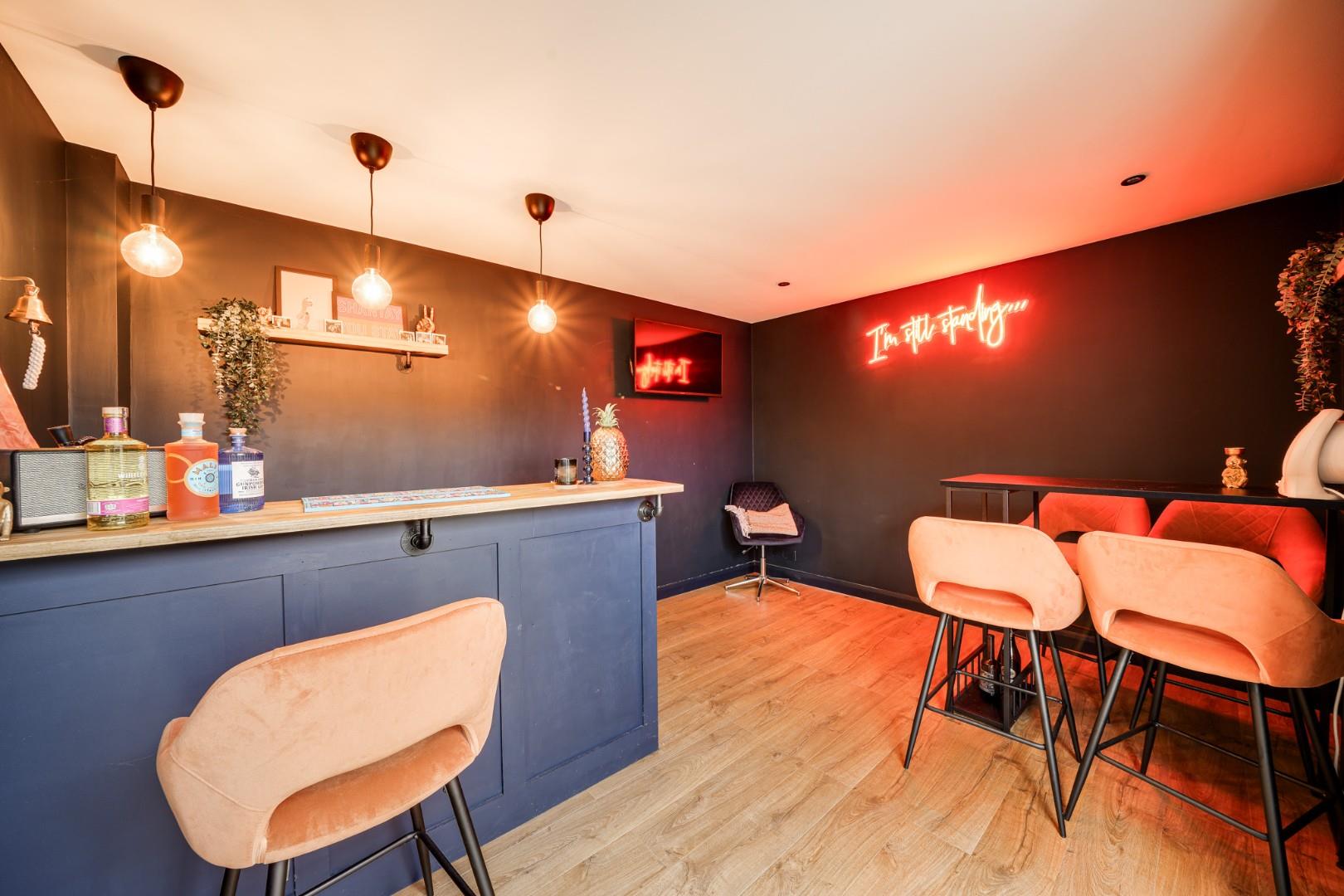 To the rear is a fully enclosed garden, thoughtfully arranged to provide a pleasant space for outdoor dining and relaxation. A particular feature of this property is the garage, which is set back from the house and approached via a double length driveway providing off street parking for multiple vehicles. The garage itself has been cleverly portioned to create a practical storage area to the front, while the rear has been transformed into a bar and entertaining space - an excellent addition for hosting friends and family or creating a dedicated hobby or leisure area. This can be restored for use as a garage, if required.