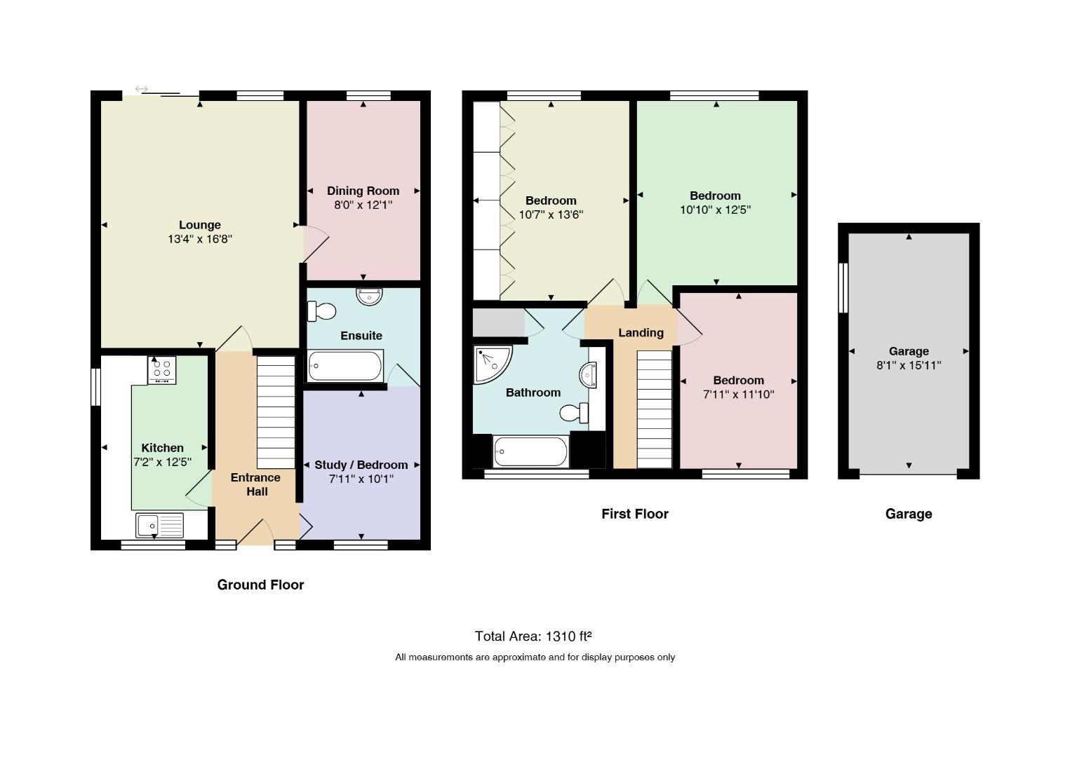 The home is entered via a central hallway, with wood-effect flooring providing a welcoming feel that continues throughout the main ground floor rooms and there is also a built-in storage cupboard. To the left is the kitchen/breakfast room, which is fitted with a range of wall and base level units with roll-edged work surfaces. There are spaces for a cooker with hood over, fridge freezer, and washing machine, with sufficient room for a breakfast table. To the right is a highly versatile study/ground floor bedroom, converted from the original garage, complete with its own private ensuite bathroom comprising of a panel bath with mixer tap and shower attachment, vanity wash hand basin, and low level WC. This space is ideal for guests, older children, multigenerational living, or working from home. Straight ahead, the impressive lounge provides a superb main living space, with a feature fireplace acting as a focal point and patio doors opening to the rear garden, bathing the room in natural light. A door leads into the dining room, which can comfortably accommodate a family-sized table and also benefits from patio doors to the garden, making it ideal for entertaining.