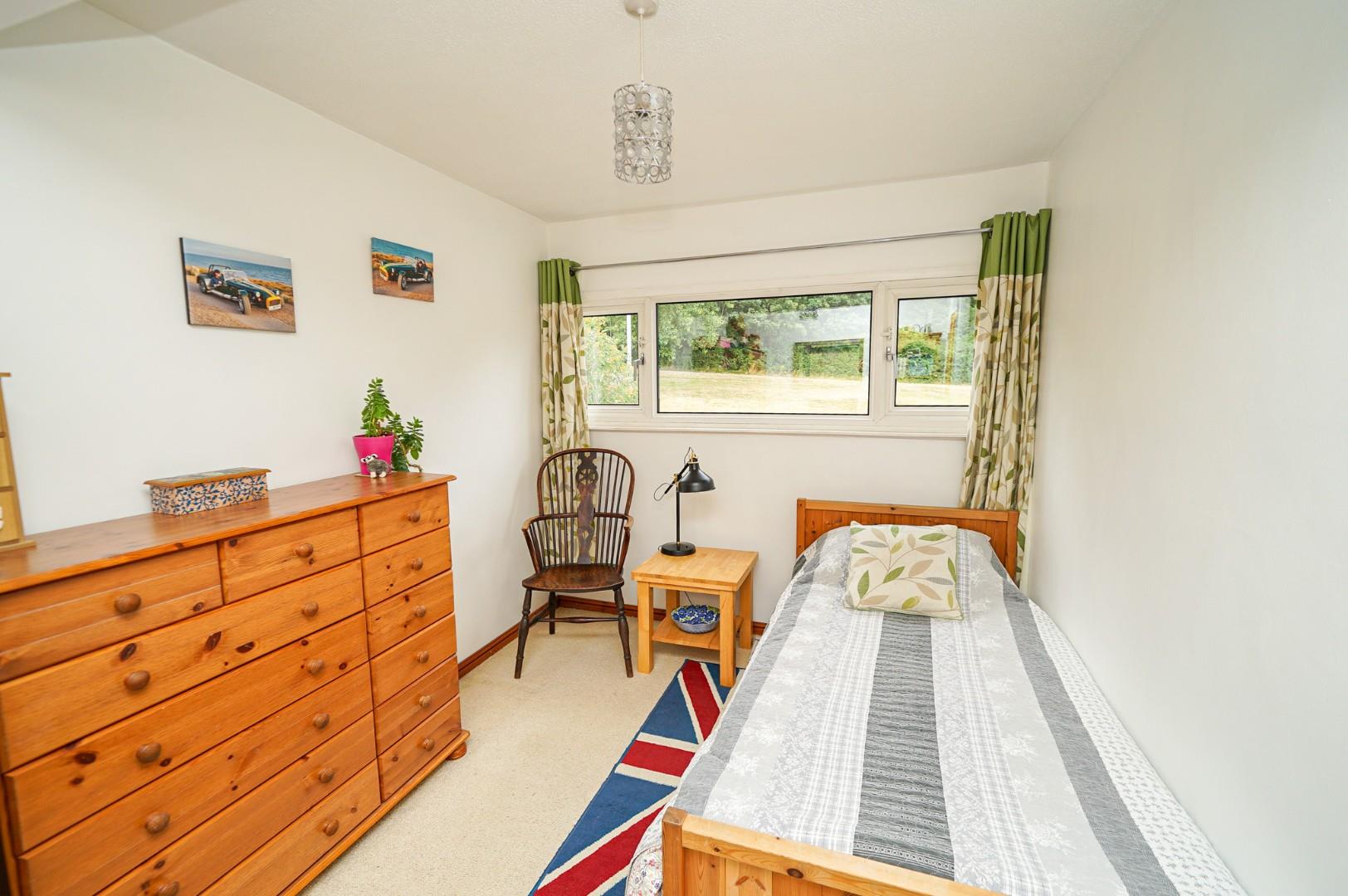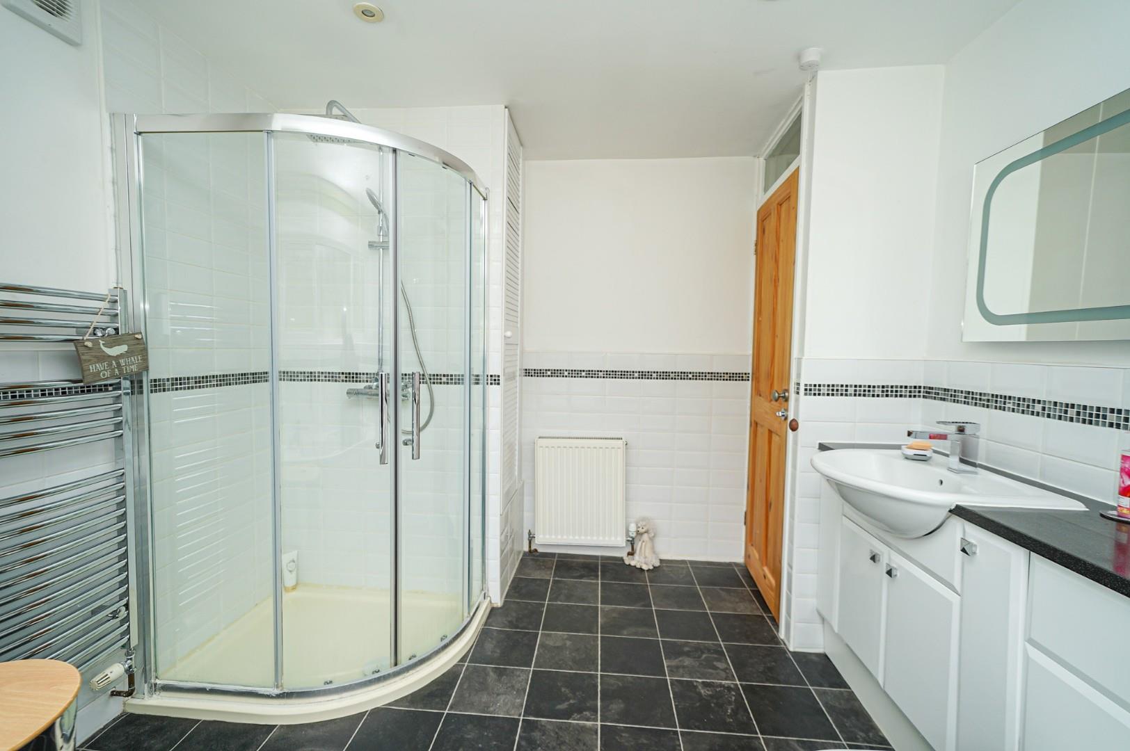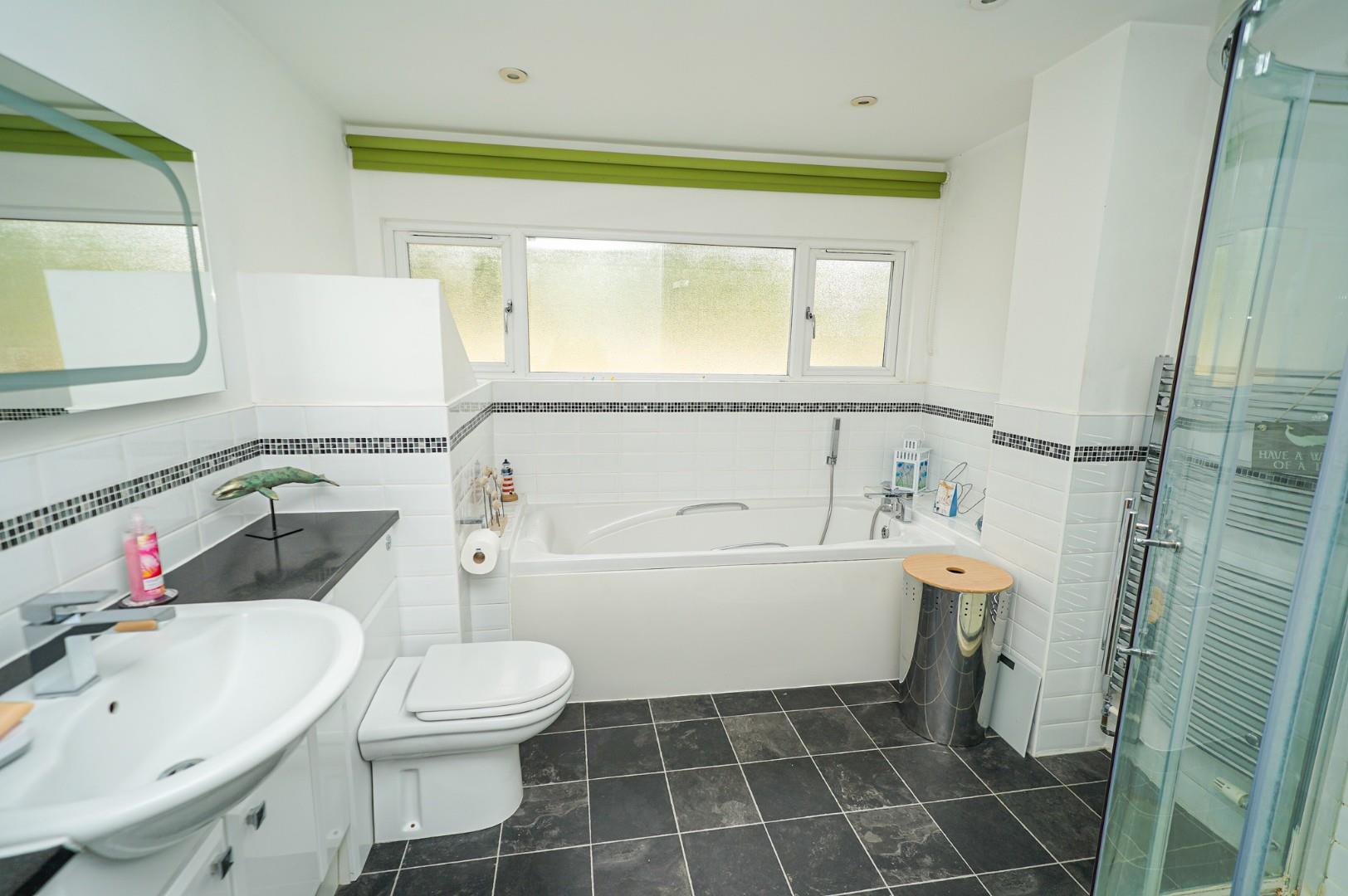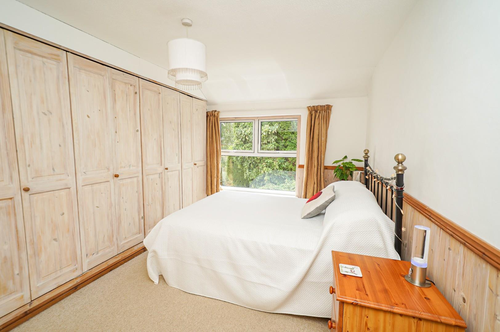 Upstairs, the first floor landing gives access to three double bedrooms and the family bathroom. The master bedroom, located to the rear, boasts a large window and an entire wall of fitted wardrobes, offering ample storage. The second bedroom also sits to the rear and is equally well-proportioned. The third double bedroom is set to the front, enjoying a peaceful view over the green. The family bathroom is larger than average and beautifully appointed with a three piece suite including a panel bath, low level WC, vanity wash hand basin, and a separate shower cubicle. An airing cupboard houses the central heating boiler and provides additional storage.