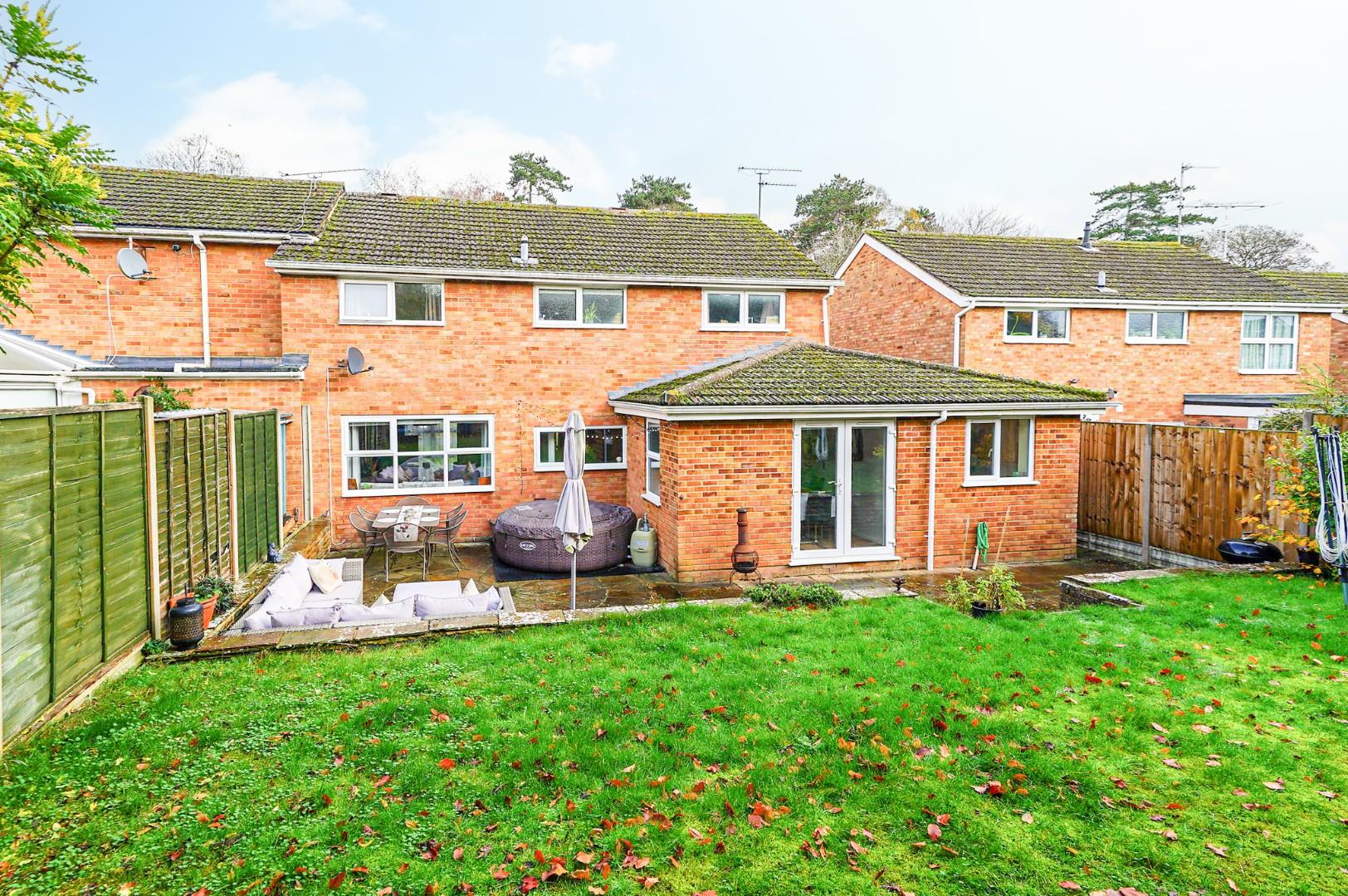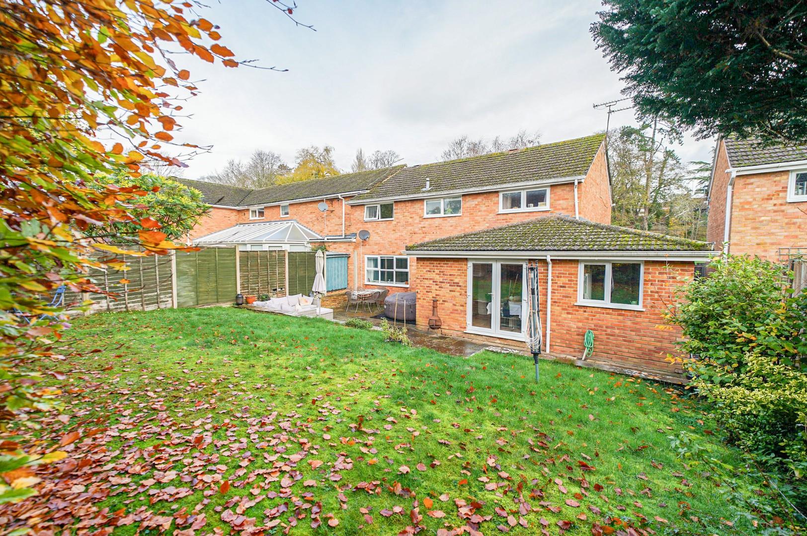 To the front, the property enjoys a generous driveway providing off-street parking and access to the garage, with the remainder laid to lawn and framed by mature shrubs. The rear garden is a particular feature of the home — private, enclosed, and benefiting from a westerly aspect that ensures plenty of afternoon and evening sunshine. A paved patio extends across the width of the house, providing the perfect space for outdoor dining or entertaining. Steps lead to a raised lawn bordered by planting and featuring a timber shed to one corner.