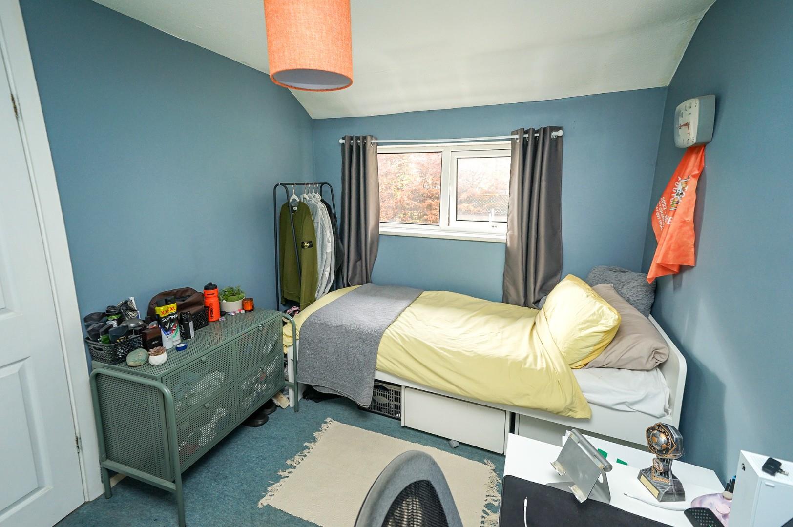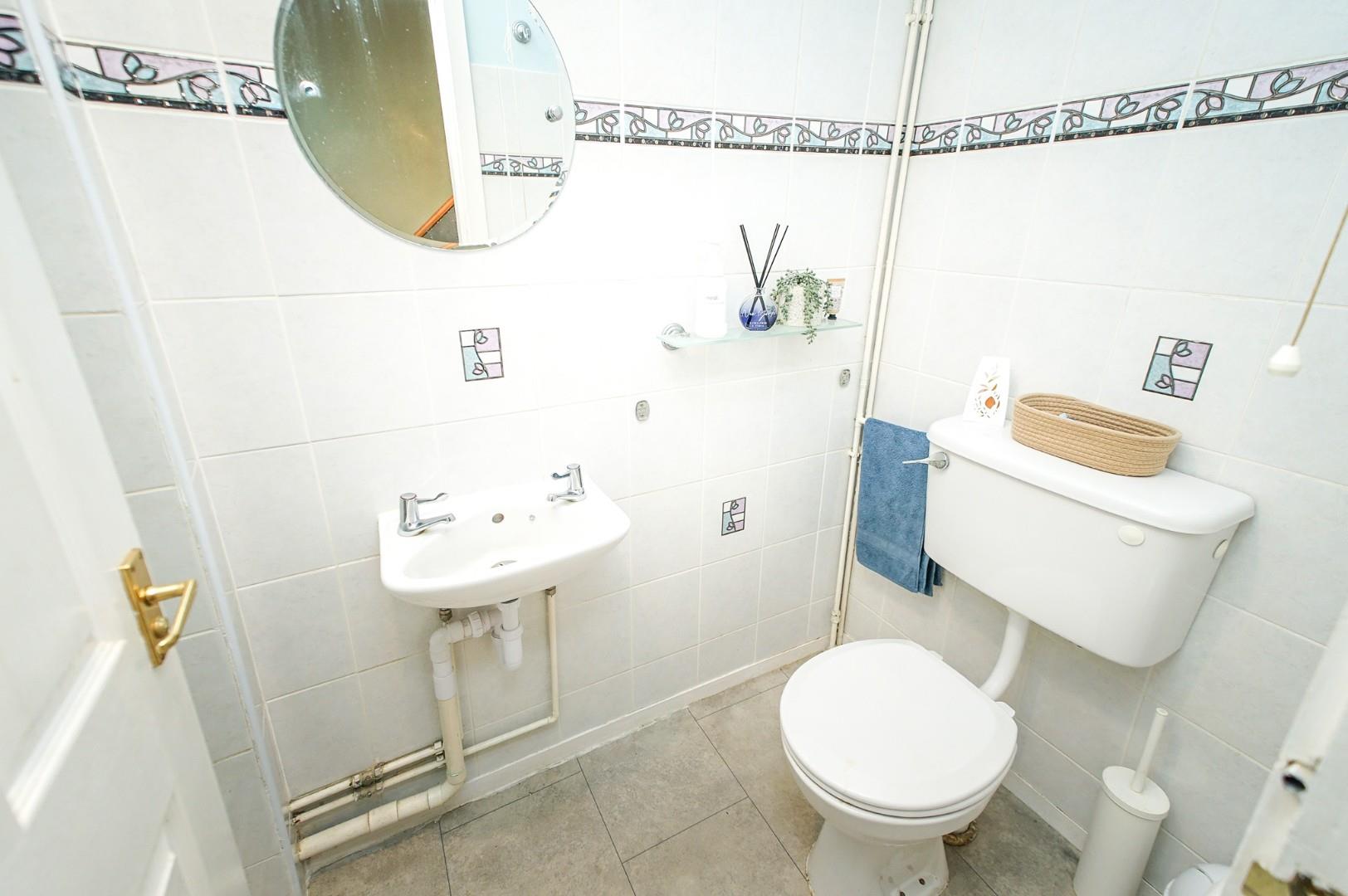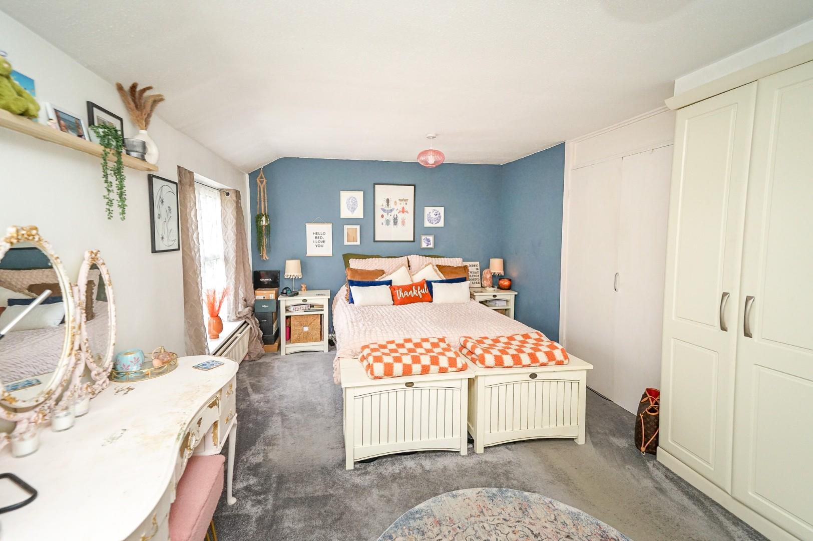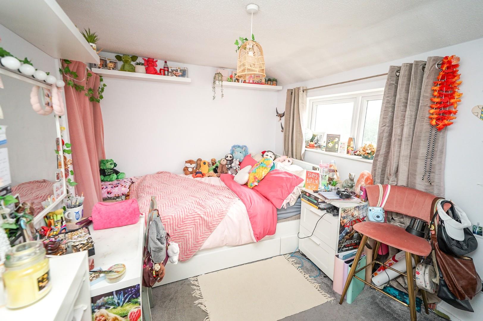The first floor landing provides access to four generous double bedrooms, the family bathroom, and the loft. The principal bedroom overlooks the front aspect and benefits from a range of built-in wardrobes. A second front-facing bedroom enjoys an equally appealing view over the green, while the two rear-facing bedrooms both overlook the private garden — the larger of which also includes a built-in wardrobe. The family bathroom is fitted with a modern three piece suite comprising a low level WC, wash hand basin, and panel bath with shower over, finished with stylish tiling.