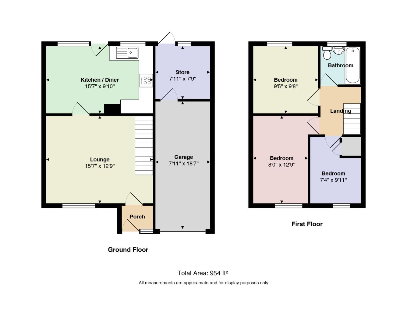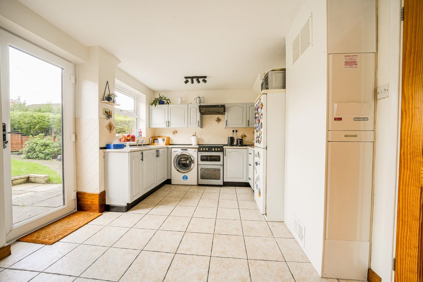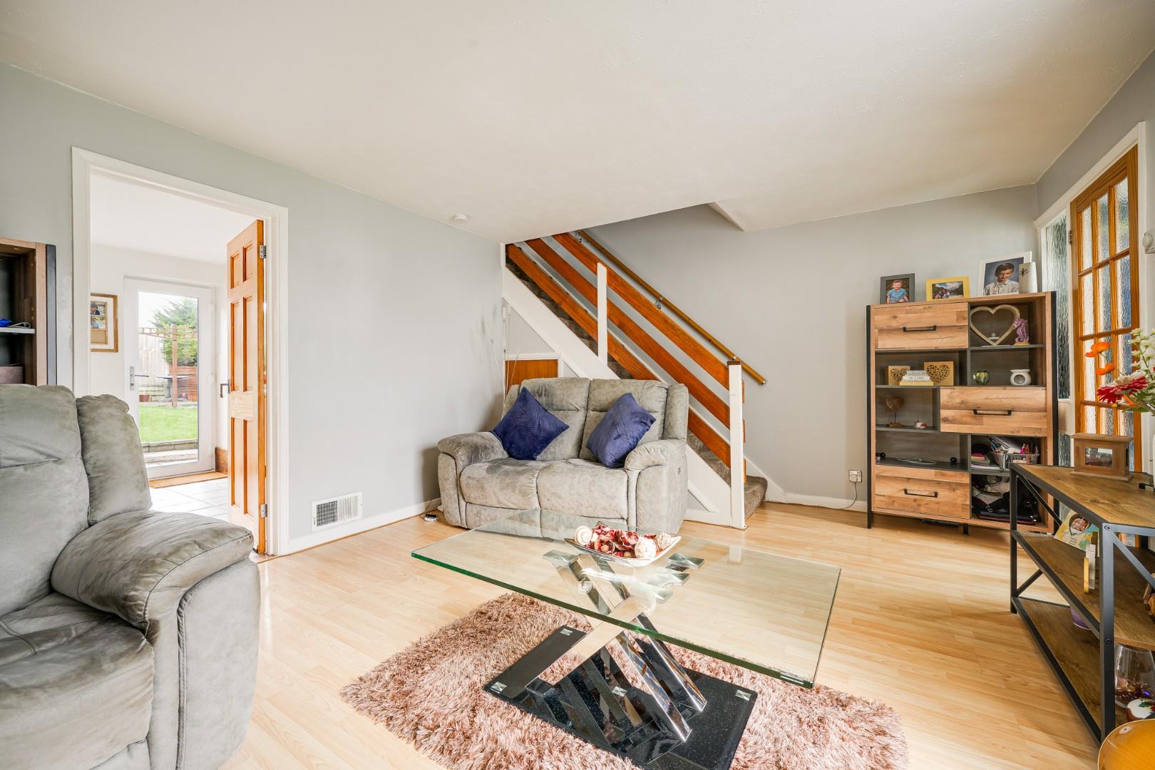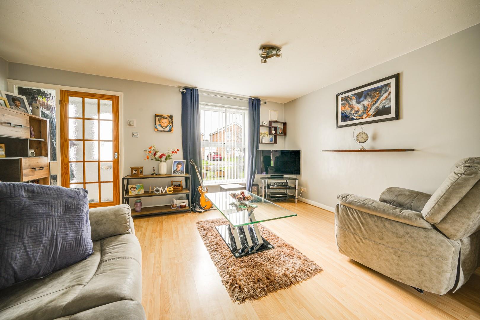 A composite front door opens into the porch with a door opening to the lounge. The lounge is a bright and comfortable reception room, offering ample space for a range of furniture and creating a relaxed family living area. The room spans the width of the property, and there are stairs leading to the first floor. A door leads to the open-plan kitchen/dining room, which sits across the rear. The kitchen is fitted with a range of wall and base level units providing good storage and work surface space, along with spaces for a variety of appliances. The dining area comfortably accommodates a family sized dining table and is well positioned to enjoy views of the rear garden. A door from the kitchen/dining room opens to the garden, making everyday life and garden access practical and convenient. To the rear of the garage there is a fitted store room, providing useful additional space — ideal for storage, gardening equipment, or workshop use.
