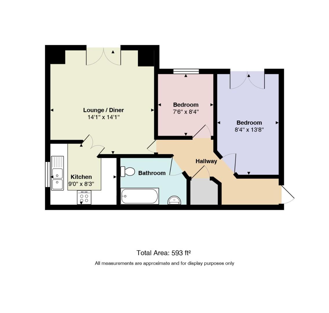 Enter via the front door into a spacious hallway which provides access to all rooms. Both bedrooms are to the front aspect, the main bedroom has a Juliet balcony which allows an ambiance of light to flow through. The second bedroom would make an excellent study or single bedroom. The lounge/diner is a generous size, a range of furniture can easily be arranged with door leading to the kitchen. The kitchen has a range of wall and base line units with ample space for white goods to suit all needs. A family bathroom completes the property and comprises of a low level WC, vanity hand wash basin and panel bath with shower over.