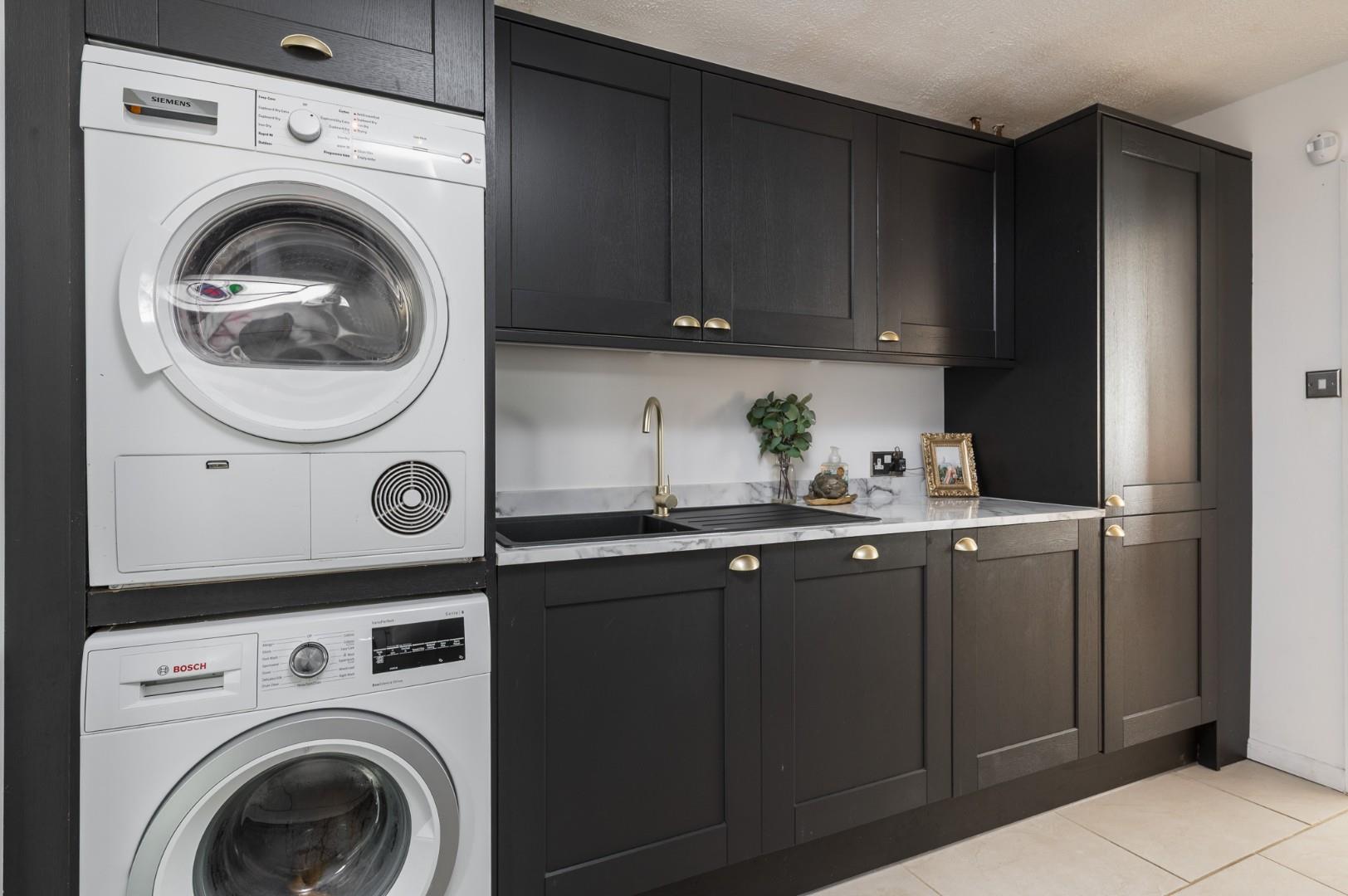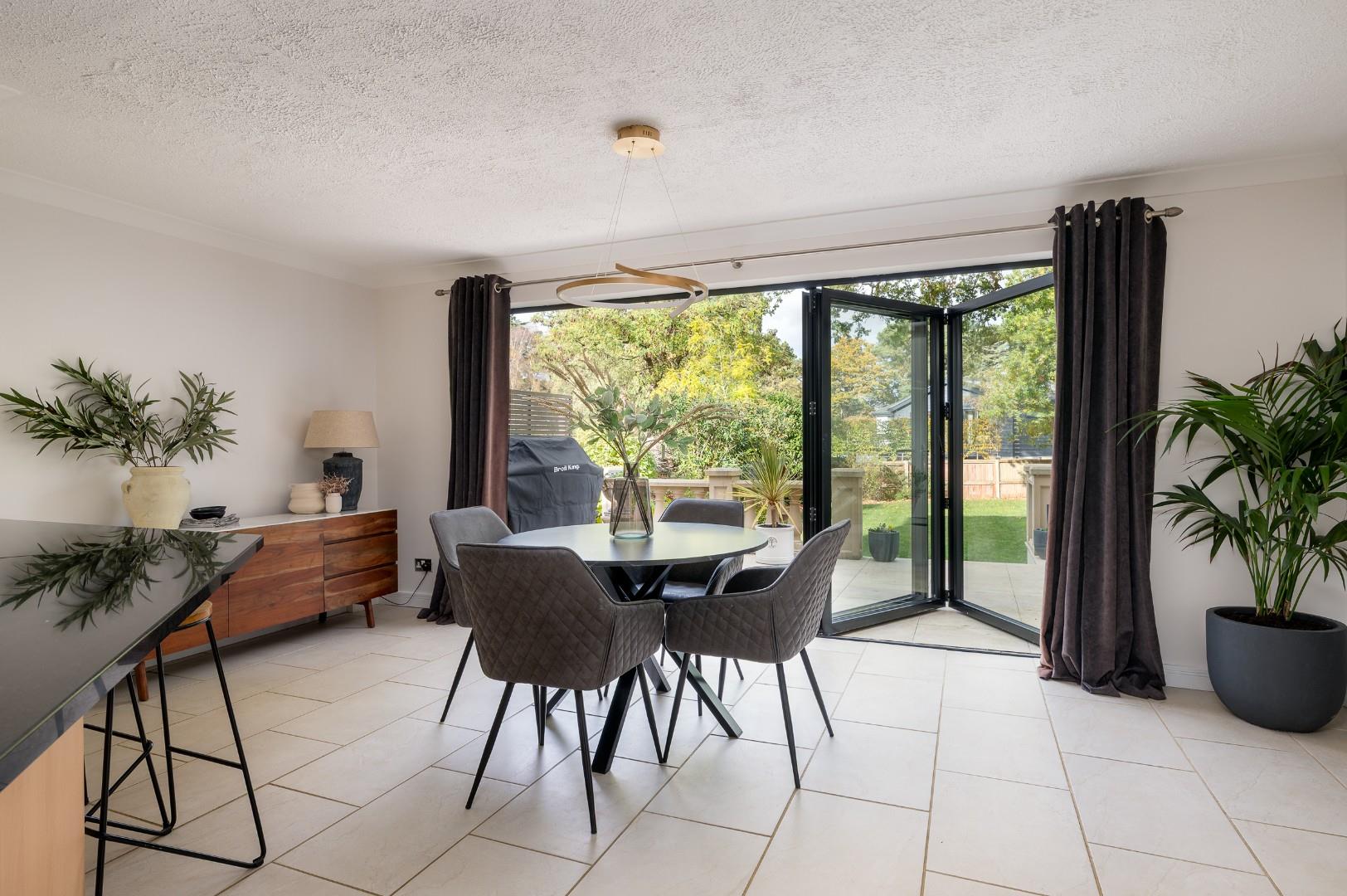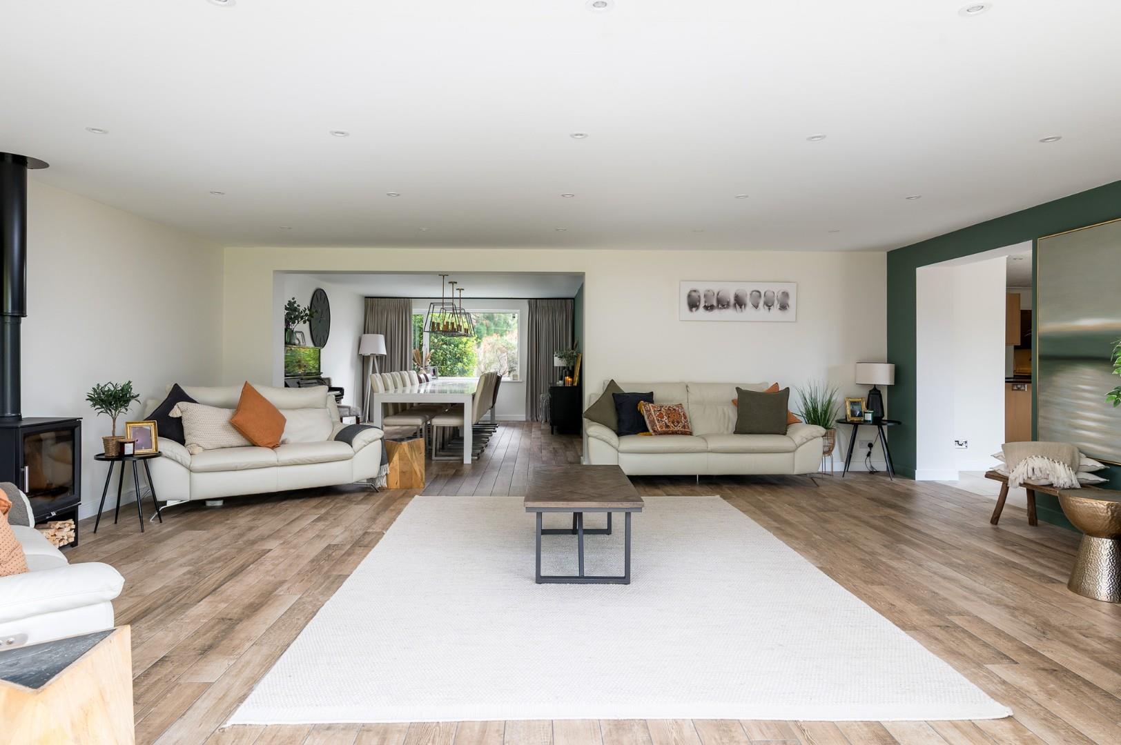 The accommodation begins with a spacious and welcoming entrance hall, finished with quality tiled flooring that immediately sets the tone for the property’s refined style. There is ample space for occasional furniture, stairs leading to the first floor with a built-in storage cupboard beneath, and doors giving access to the cloakroom/WC and kitchen/breakfast room. To the opposite side, the hallway opens seamlessly into the dining room, creating an elegant sense of flow. The ground floor layout is cleverly designed with open plan family living in mind. The dining room provides an inviting space for entertaining and comfortably accommodates a large dining table, while a former fireplace adds character and the potential for reinstatement if desired. A porcelain tiled floor continues effortlessly through into the impressive sitting room, an exceptional dual-aspect space that offers both comfort and grandeur. A wood burning stove provides a striking focal point, and bi-folding doors across the rear elevation flood the room with natural light and open directly to the patio - perfect for hosting and enjoying indoor-outdoor living. An opening leads into the kitchen/breakfast room, where the attention to detail continues. The kitchen is fitted with a range of wall and base level units with granite work surfaces over, complemented by quality integrated appliances including a dishwasher, oven, two warming drawers, and a five-ring gas hob with extractor over. There is also space for an American-style fridge freezer. The breakfast area provides ample space for a table and enjoys beautiful garden views via a further set of bi-folding doors. Underfloor heating extends through this space, creating a luxurious feel. The utility room is fitted with a further range of shaker-style units, an additional dishwasher, and spaces for both a washing machine and tumble dryer. There is a courtesy door to the front driveway and another leading to the converted former garage, which now offers a superb home office - ideal for remote working - plus a useful store room beyond..