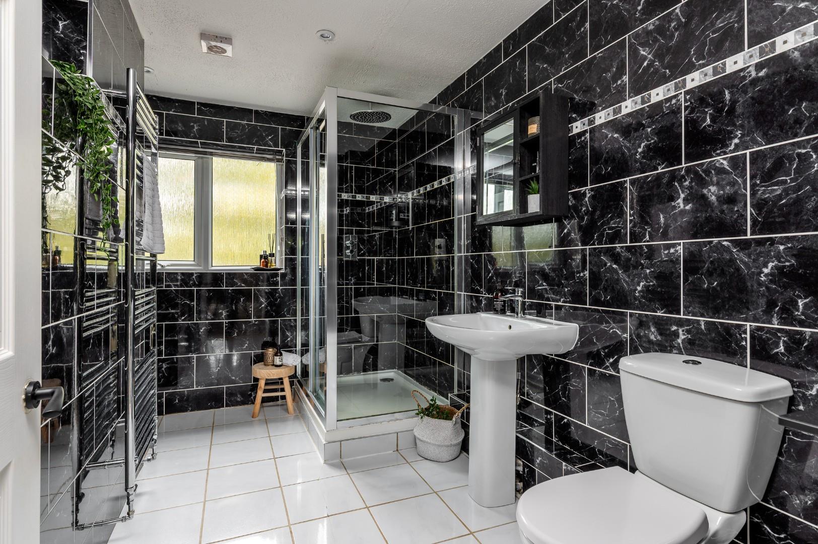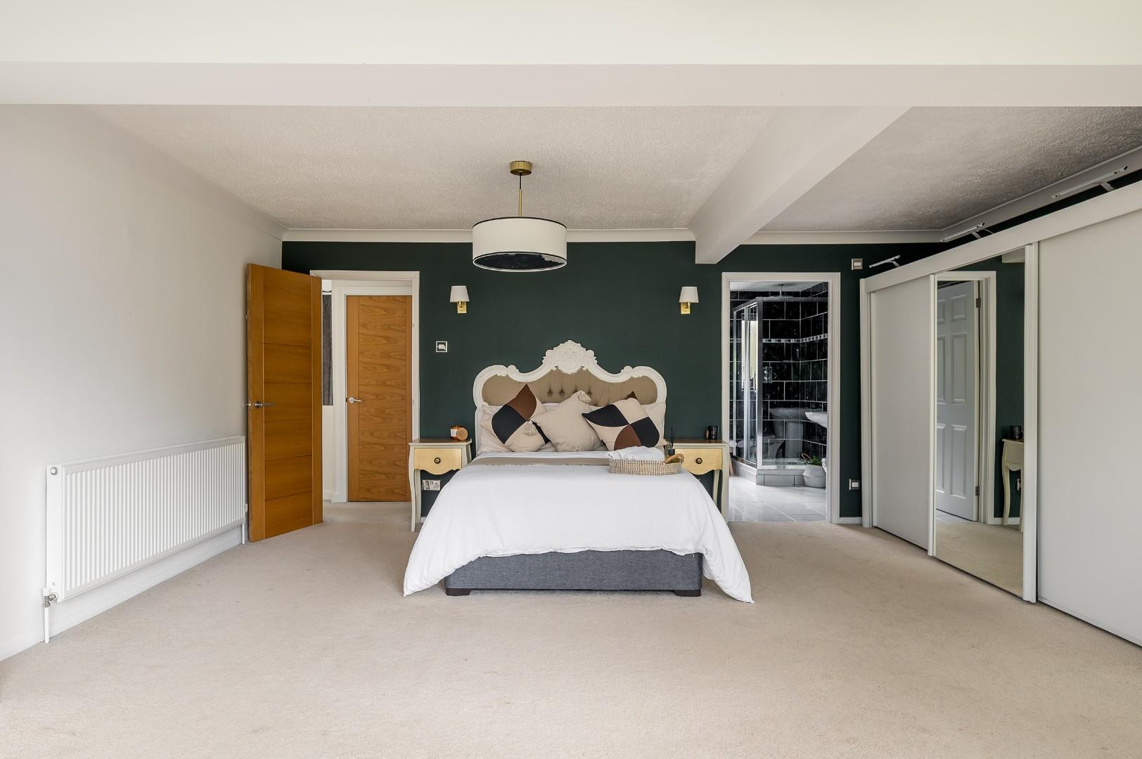 Upstairs, the central landing connects to all four bedrooms and the family bathroom. The master suite is a true retreat - exceptionally large and overlooking the tranquil rear garden. A full wall of fitted wardrobes provides excellent storage, and the ensuite shower room includes underfloor heating, a three-piece suite and tasteful tiling to floor and walls. Bedrooms two and three also benefit from built-in wardrobes and garden views, while bedroom four faces the front and features a useful recessed space for storage or a wardrobe. The family bathroom continues the home’s sense of quality, with underfloor heating, a three-piece suite and stylish tiling throughout.