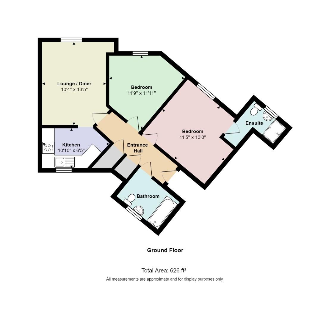 The hallway features a built in storage cupboard plus an airing cupboard, and doors lead to the lounge, diner, bedrooms and bathroom. The bright and airy lounge/diner is situated at the end of the hallway and provides plenty of space for a range of living room furniture plus a dining table. There is an opening to the separate kitchen which is fitted with a range of wall and base level units, and there are spaces for appliances. The unusual shape of this property has resulted in generous room sizes, with both bedrooms enjoying plenty of space, and the master bedroom has the convenience of an ensuite shower room. The larger than usual bathroom has been refitted with a modern three piece bath suite.