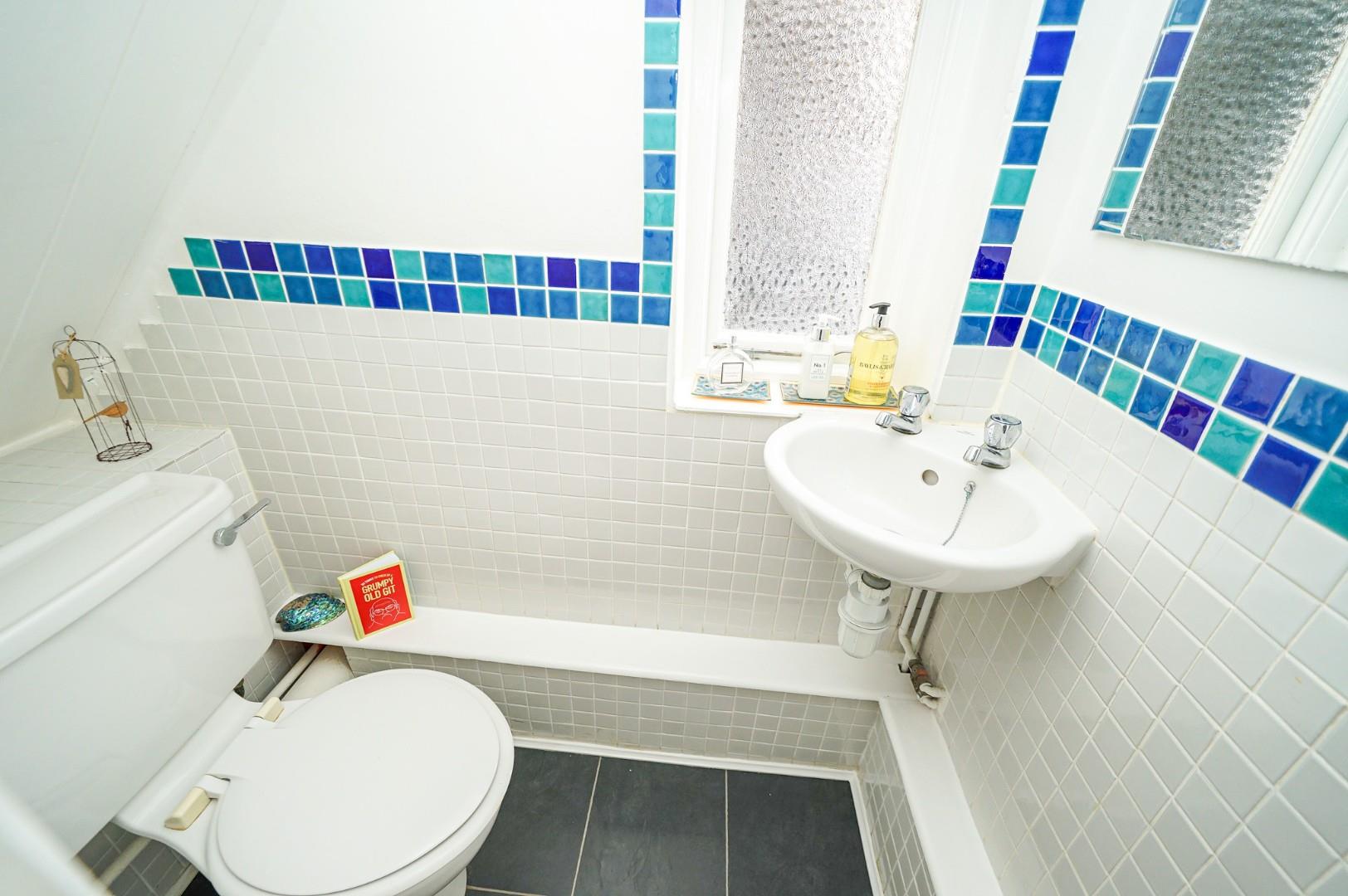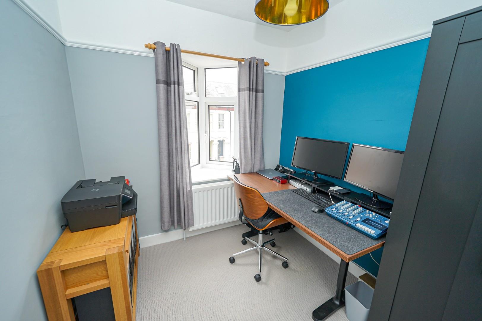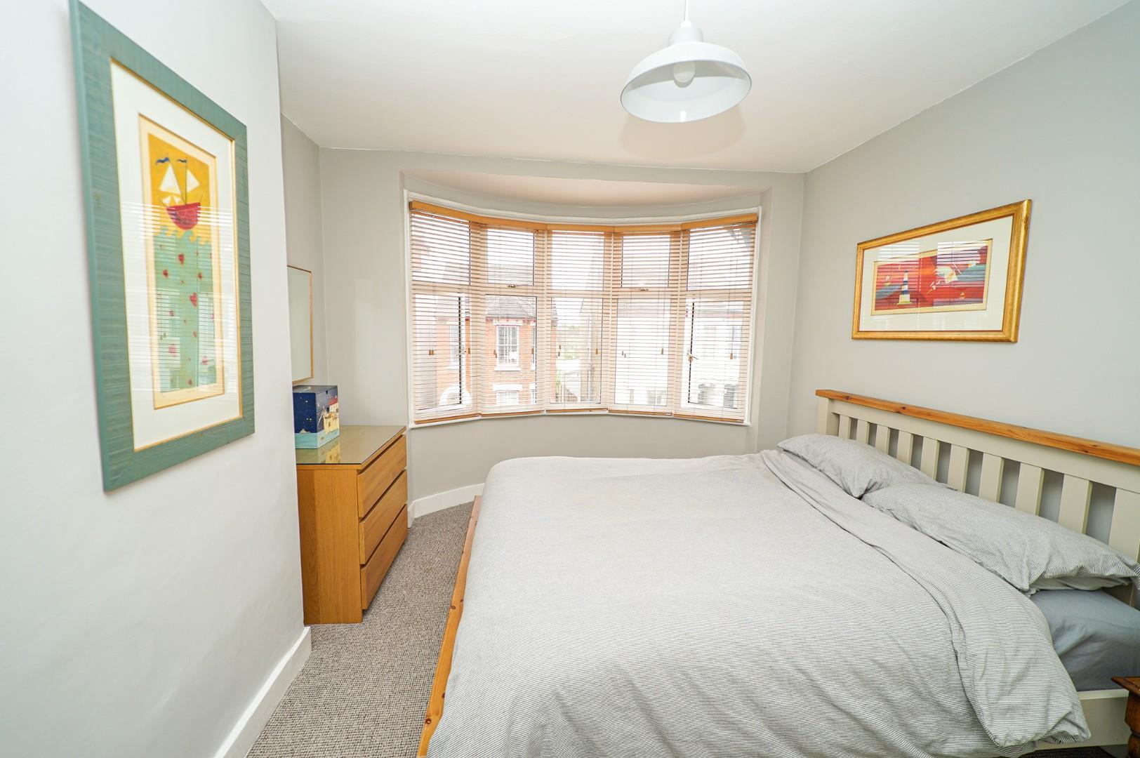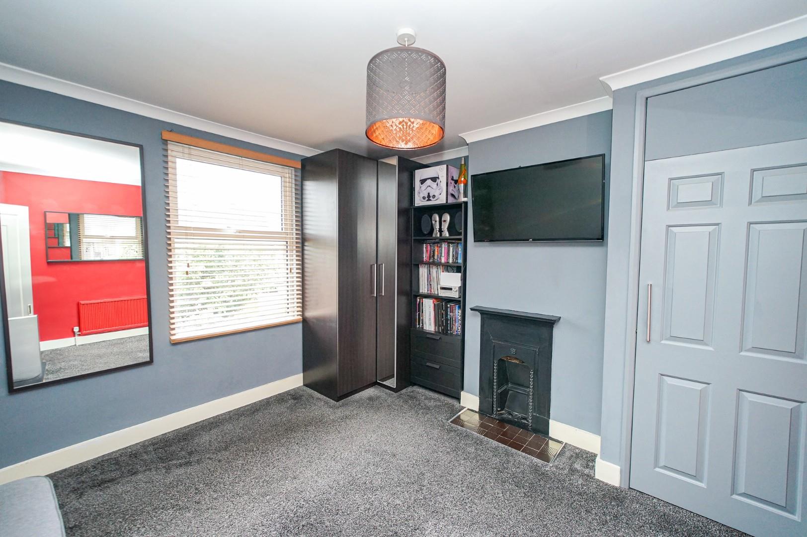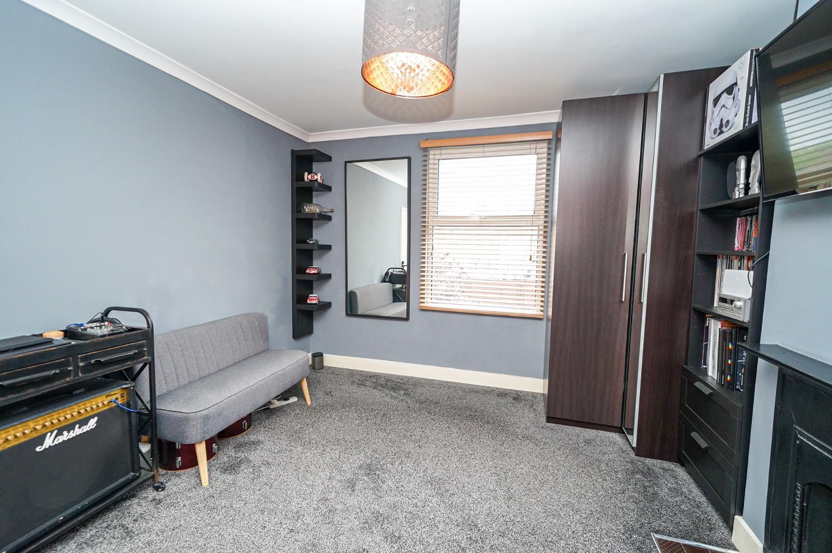 On the first floor, the landing provides access to three of the four bedrooms and the family bathroom, with stairs ascending to the fourth bedroom. The principal bedroom faces the front aspect, where natural light floods through the bay window into a spacious room with ample space for a comprehensive range of bedroom furniture. A charming single bedroom, also front-facing, would serve equally well as a study and enjoys excellent natural light. The rear-facing double bedroom retains its original fireplace as an attractive period feature, overlooking the rear garden with plenty of room for bedroom furniture and benefiting from a useful airing cupboard for additional storage. The family bathroom, positioned to the rear, features a three-piece suite comprising low-level WC, vanity wash hand basin and jacuzzi bath with shower over.