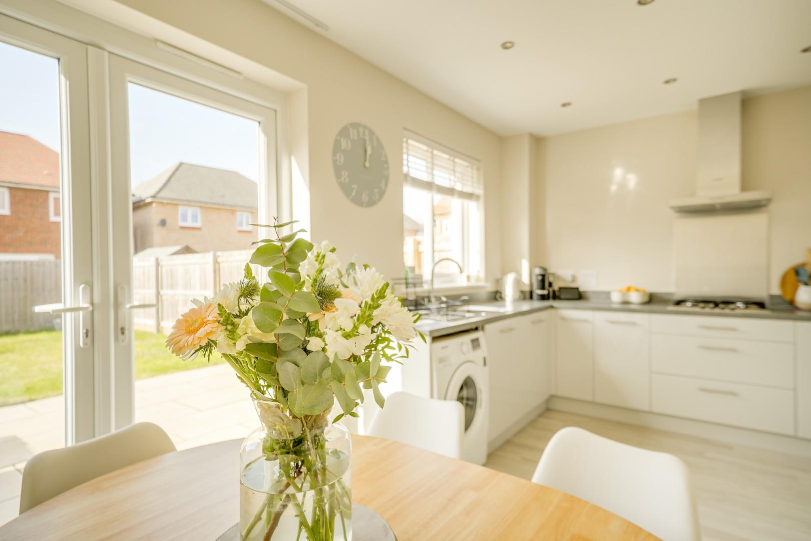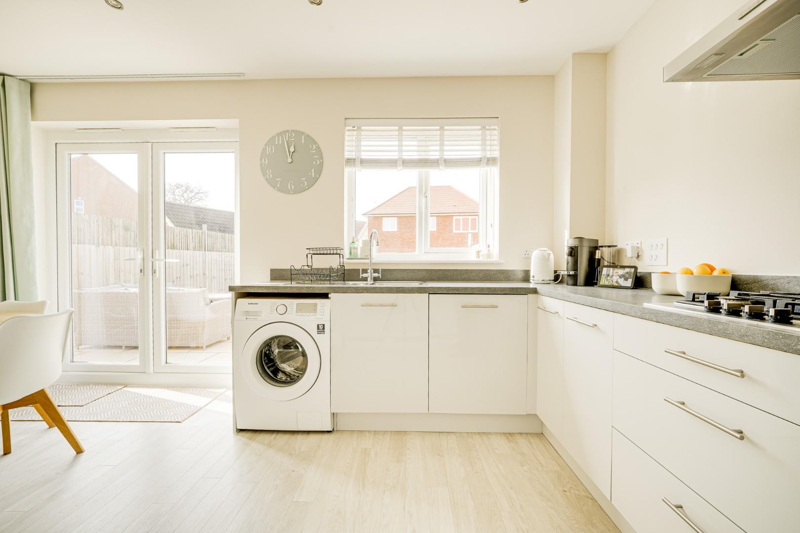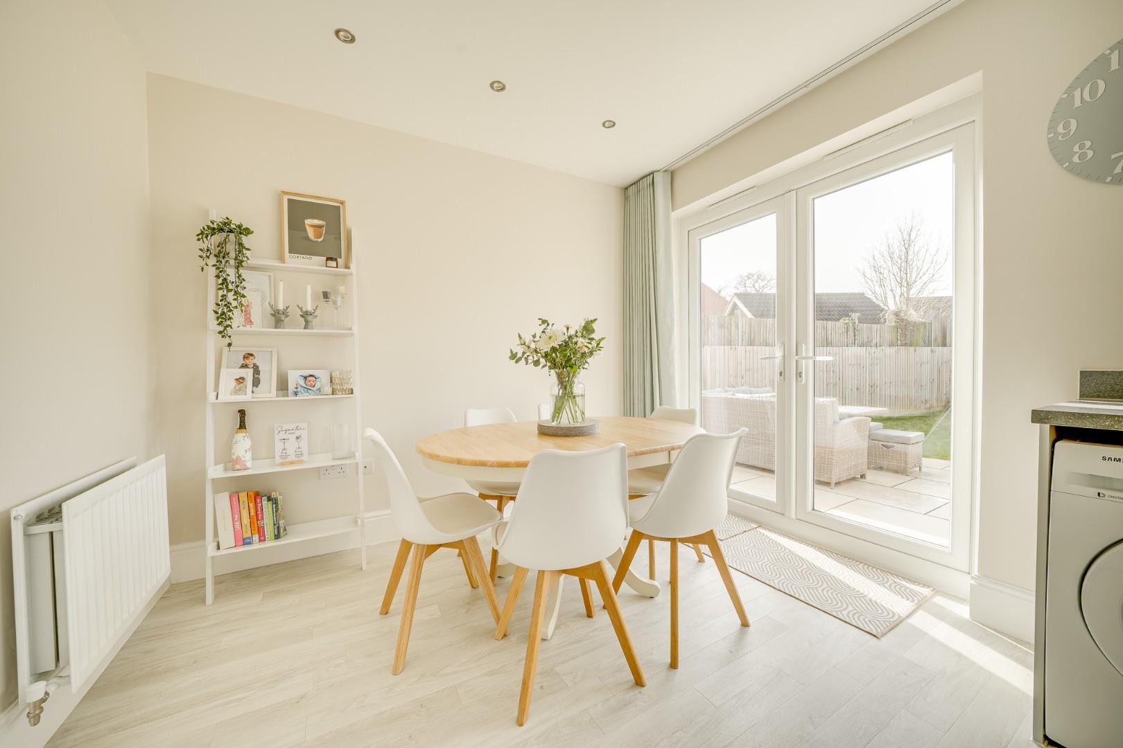 A composite front door opens into the entrance hall, where Amtico flooring flows seamlessly throughout the entire ground floor, creating a smart and cohesive finish. From here there is access to the cloakroom/WC and a door leading into the lounge. The 16ft lounge is a well proportioned and comfortable reception room with ample space for a variety of furniture arrangements. Stairs rise to the first floor with a useful built-in storage cupboard beneath, and a door leads through to the kitchen/dining room. Spanning the full width of the property, the kitchen/dining room is a real highlight of the home. Fitted with a modern range of wall and base level units, it includes integrated appliances comprising dishwasher, washing machine, fridge freezer, double oven and gas hob with extractor hood over. The dining area provides generous space for a family sized table, ideal for both everyday living and entertaining. Double glazed French doors open directly onto the rear garden, allowing for a seamless connection between indoor and outdoor spaces.