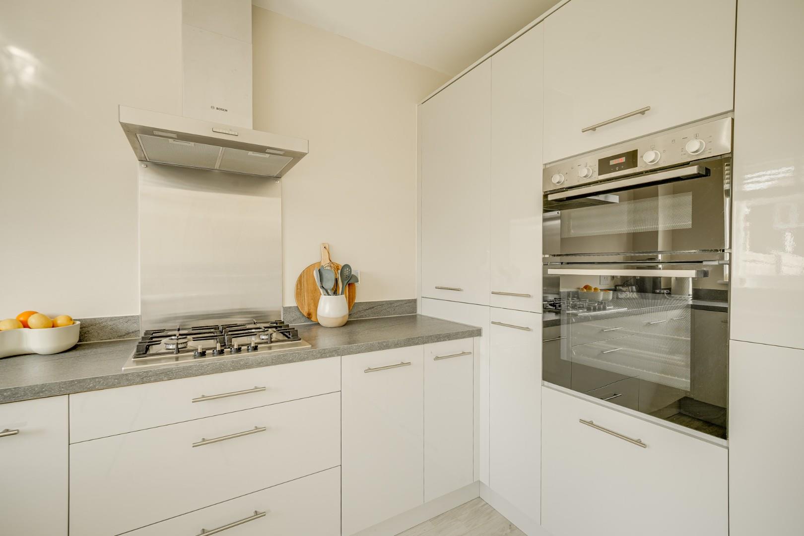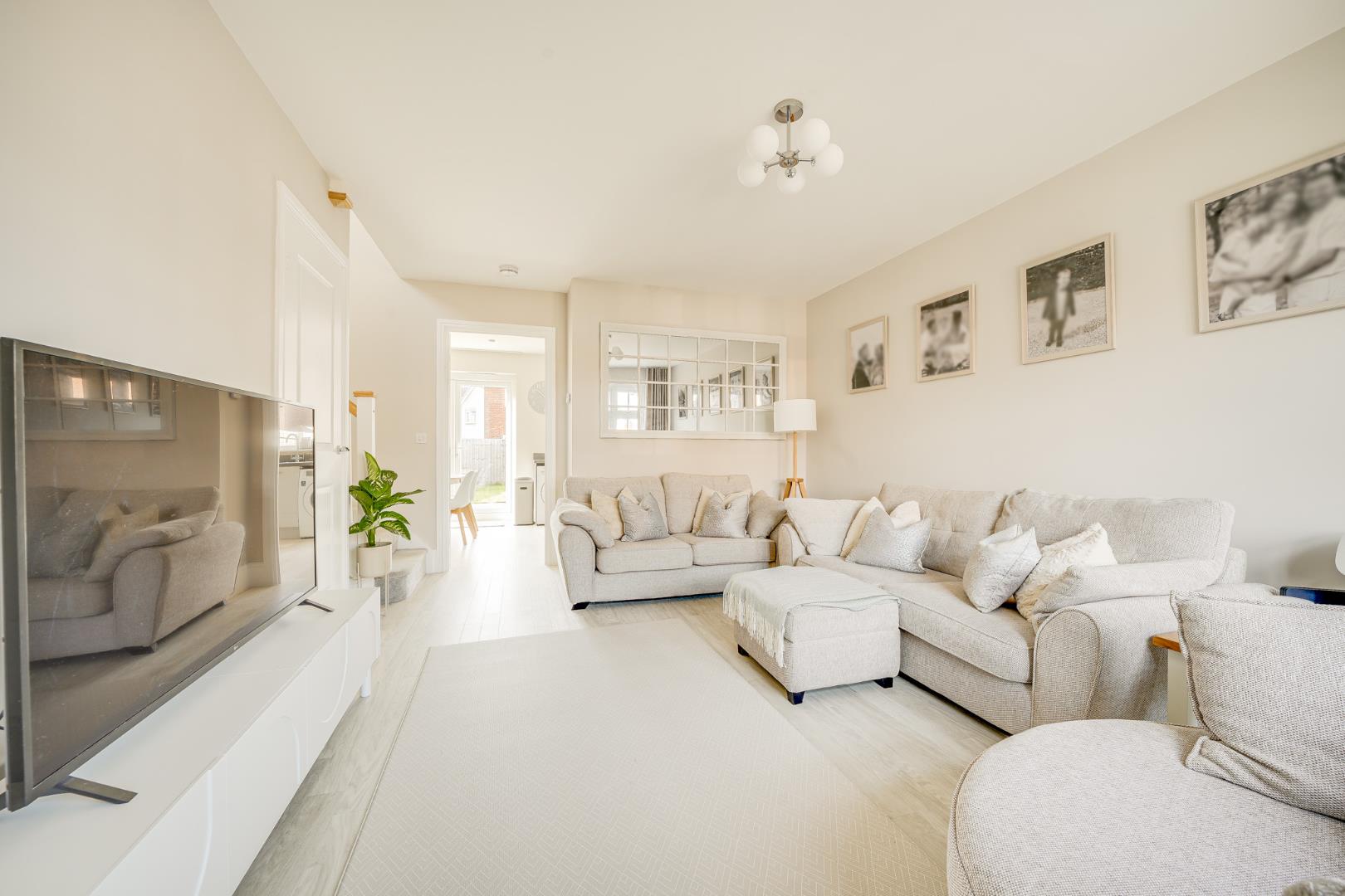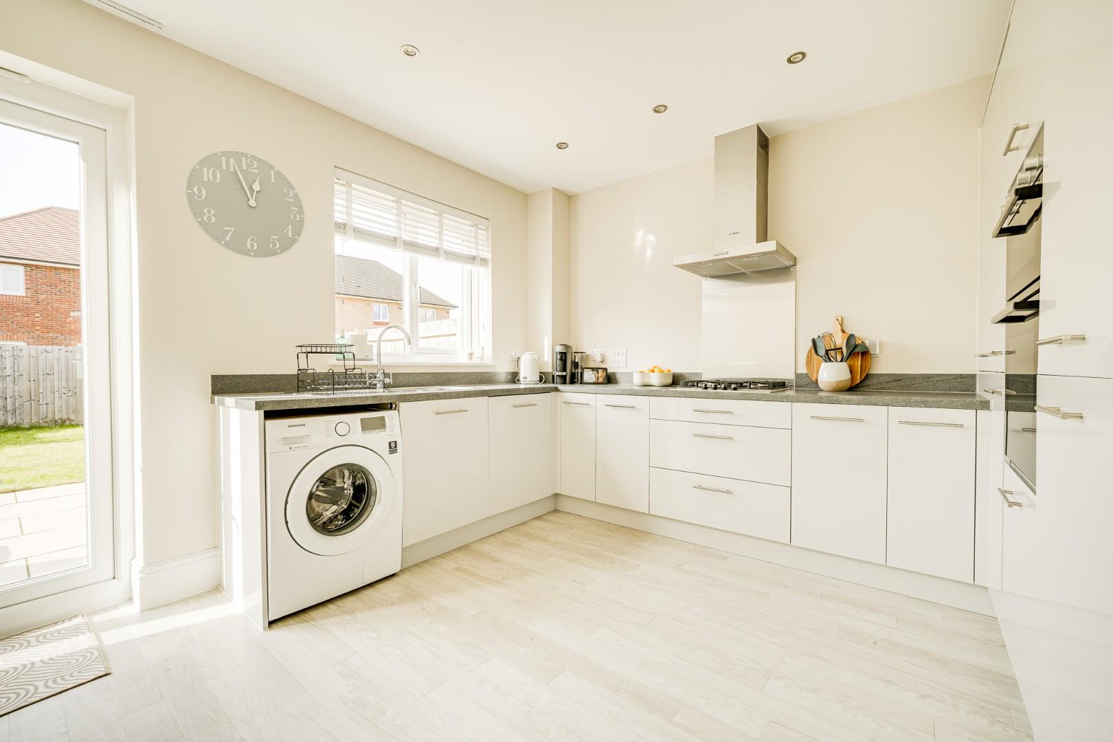 A composite front door opens into the entrance hall, where Amtico flooring flows seamlessly throughout the entire ground floor, creating a smart and cohesive finish. From here there is access to the cloakroom/WC and a door leading into the lounge. The 16ft lounge is a well proportioned and comfortable reception room with ample space for a variety of furniture arrangements. Stairs rise to the first floor with a useful built-in storage cupboard beneath, and a door leads through to the kitchen/dining room. Spanning the full width of the property, the kitchen/dining room is a real highlight of the home. Fitted with a modern range of wall and base level units, it includes integrated appliances comprising dishwasher, washing machine, fridge freezer, double oven and gas hob with extractor hood over. The dining area provides generous space for a family sized table, ideal for both everyday living and entertaining. Double glazed French doors open directly onto the rear garden, allowing for a seamless connection between indoor and outdoor spaces.