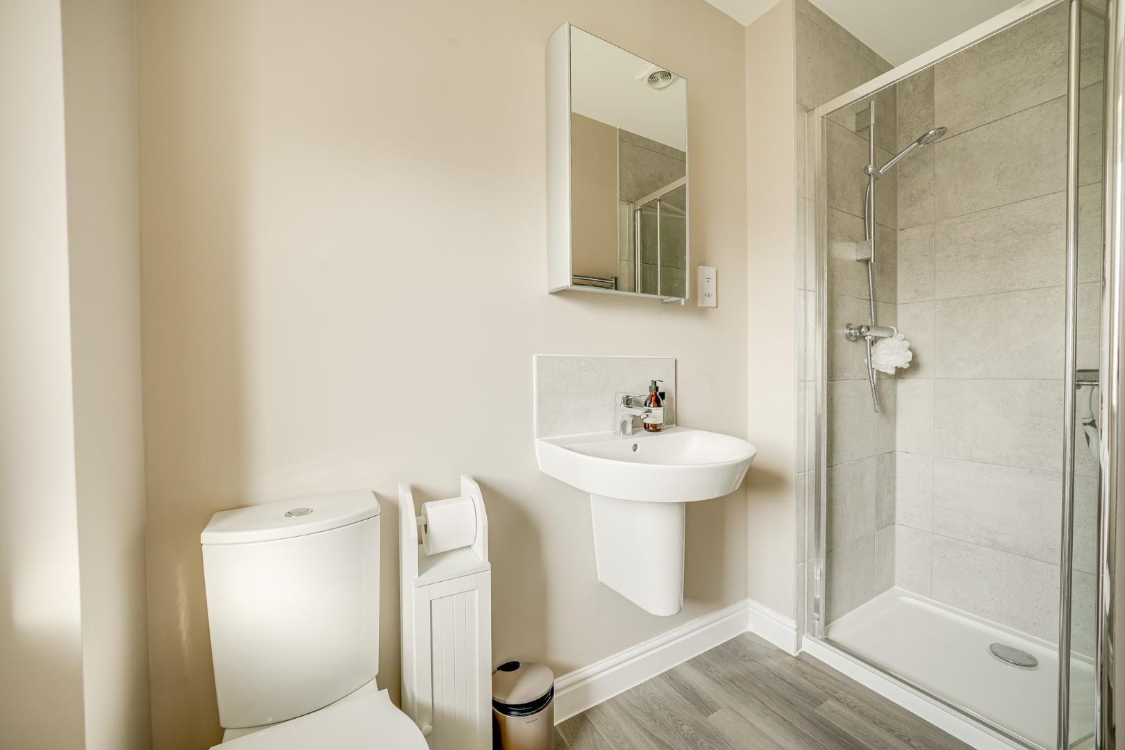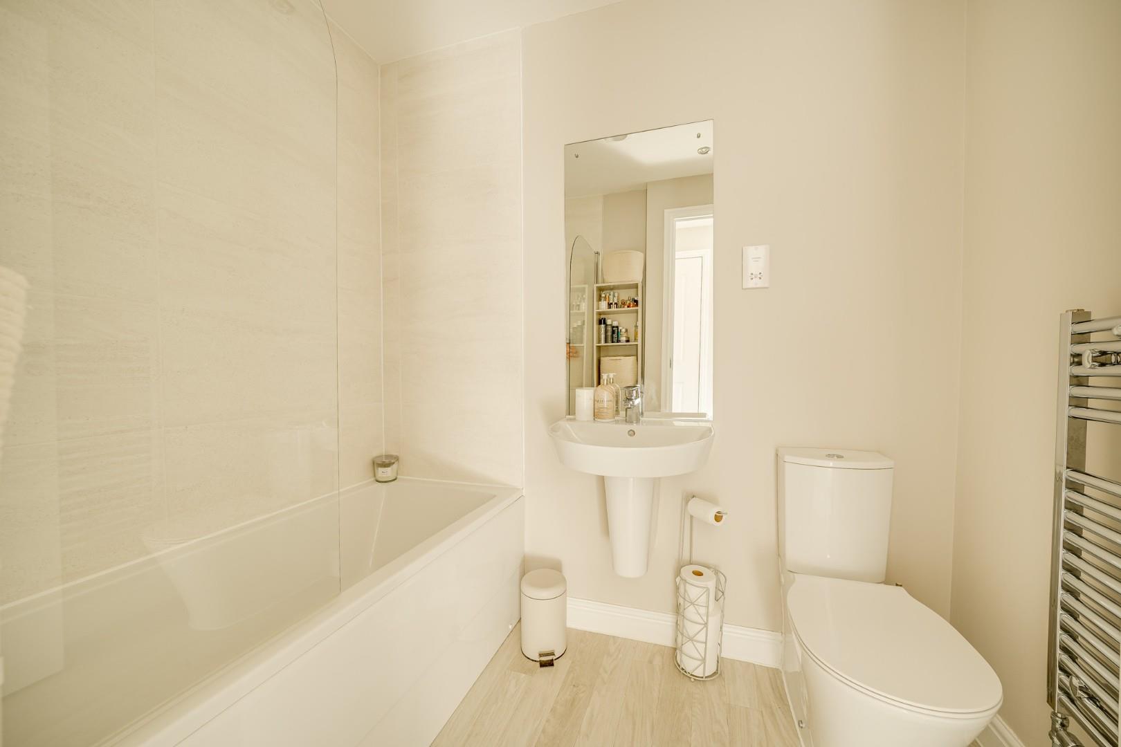 The landing provides access to all three bedrooms, the family bathroom, loft space and a built-in airing cupboard. The master bedroom sits to the rear and is a well proportioned double room benefiting from built-in wardrobes and a modern ensuite shower room. Bedrooms two and three are both generous rooms positioned to the front aspect, offering flexibility for use as additional bedrooms, guest accommodation or a home office, with the third bedroom also featuring fitted with quality 'Sharps' wardrobes to one wall. The family bathroom is fitted with a contemporary three piece suite comprising low level WC, wash hand basin and panel bath with shower over, complemented by tiling to water sensitive areas.