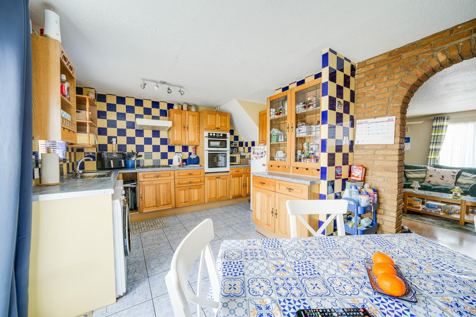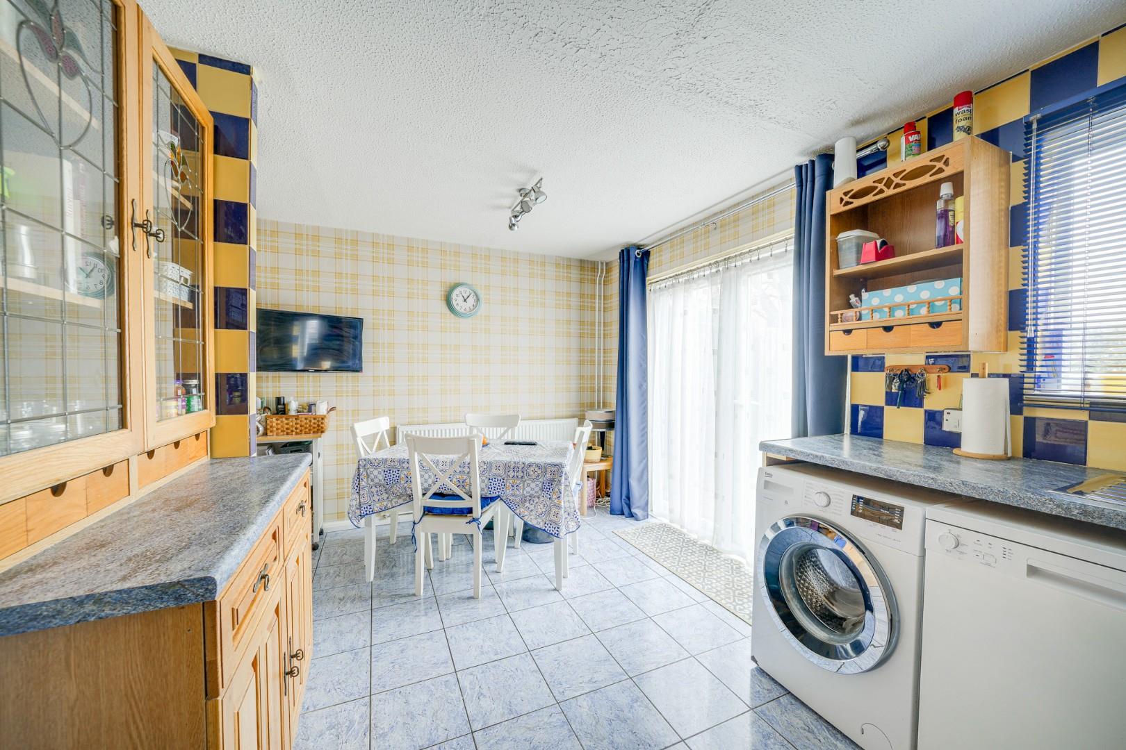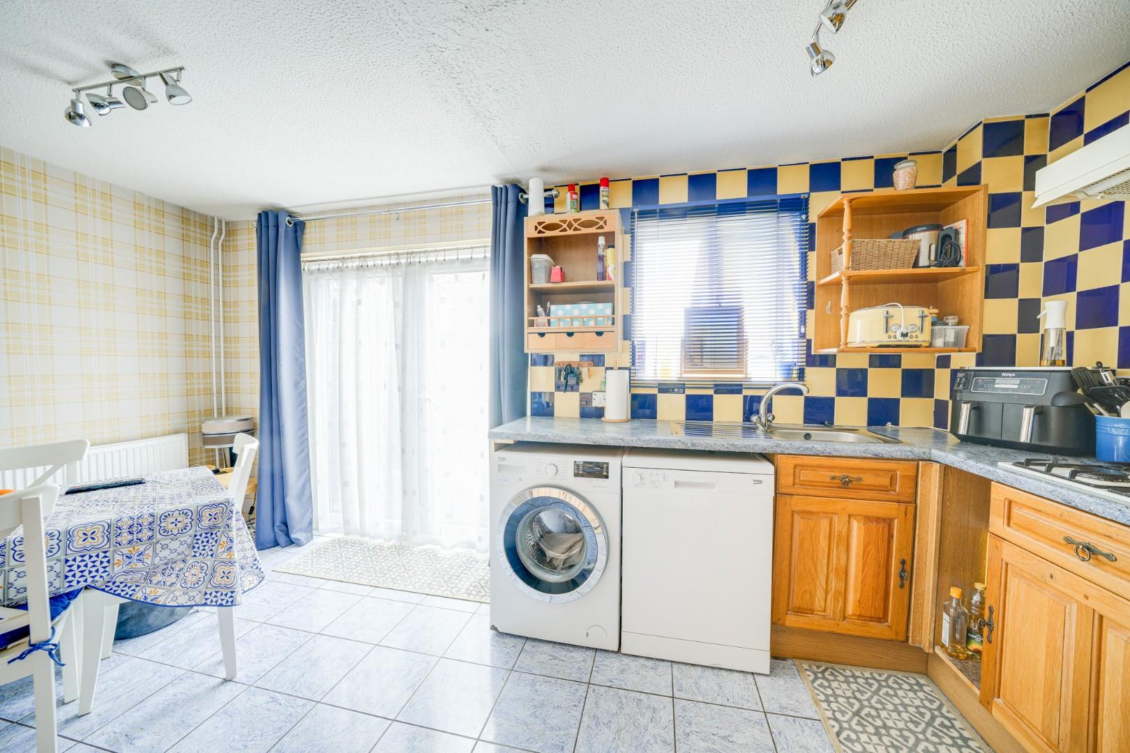 Enter via a UPVC front door into the entrance porch, which provides practical space for coats and shoe storage. A further door opens into the spacious lounge, which features wood effect flooring and comfortably accommodates a range of living room furniture. Stairs rise to the first floor and an opening leads through to the kitchen/dining room, creating a sociable layout. Spanning the rear of the property, the kitchen/dining room is fitted with a range of wall and base level units with work surfaces over, incorporating an integrated double oven and four ring gas hob. There are designated spaces for a washing machine, dishwasher and fridge freezer, while tiled flooring enhances practicality. The room comfortably accommodates a family dining table and double glazed French doors open directly onto the rear garden, allowing plenty of natural light.