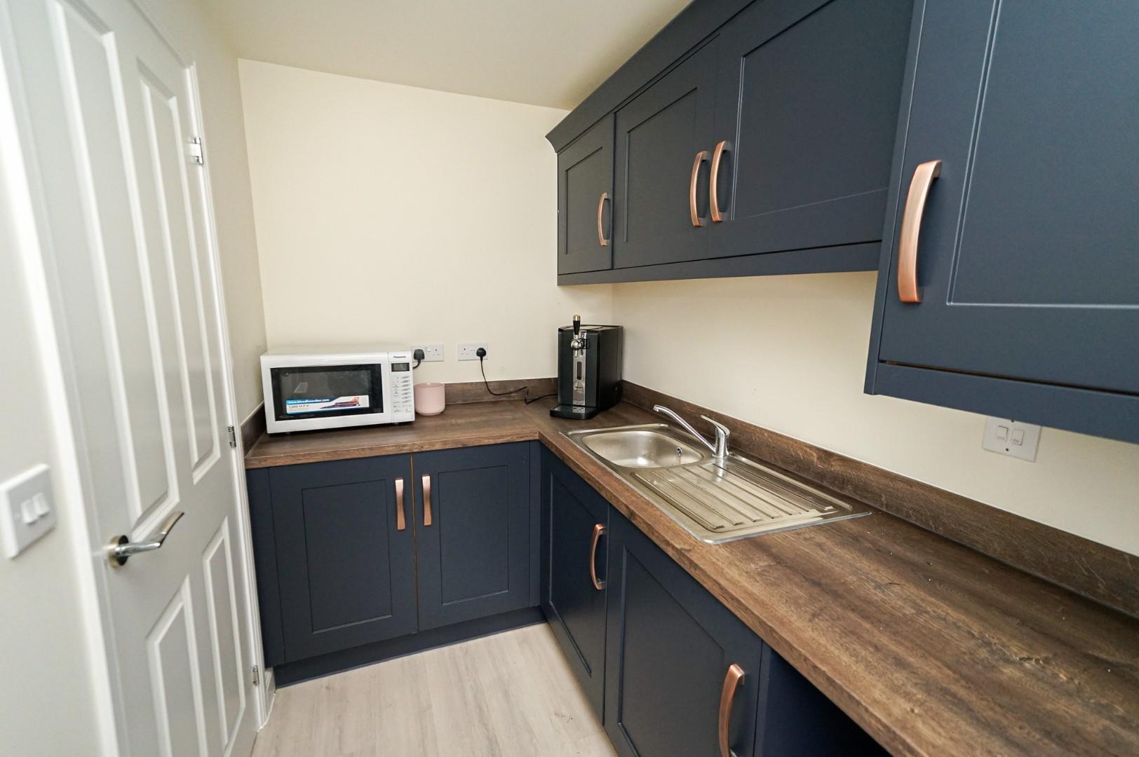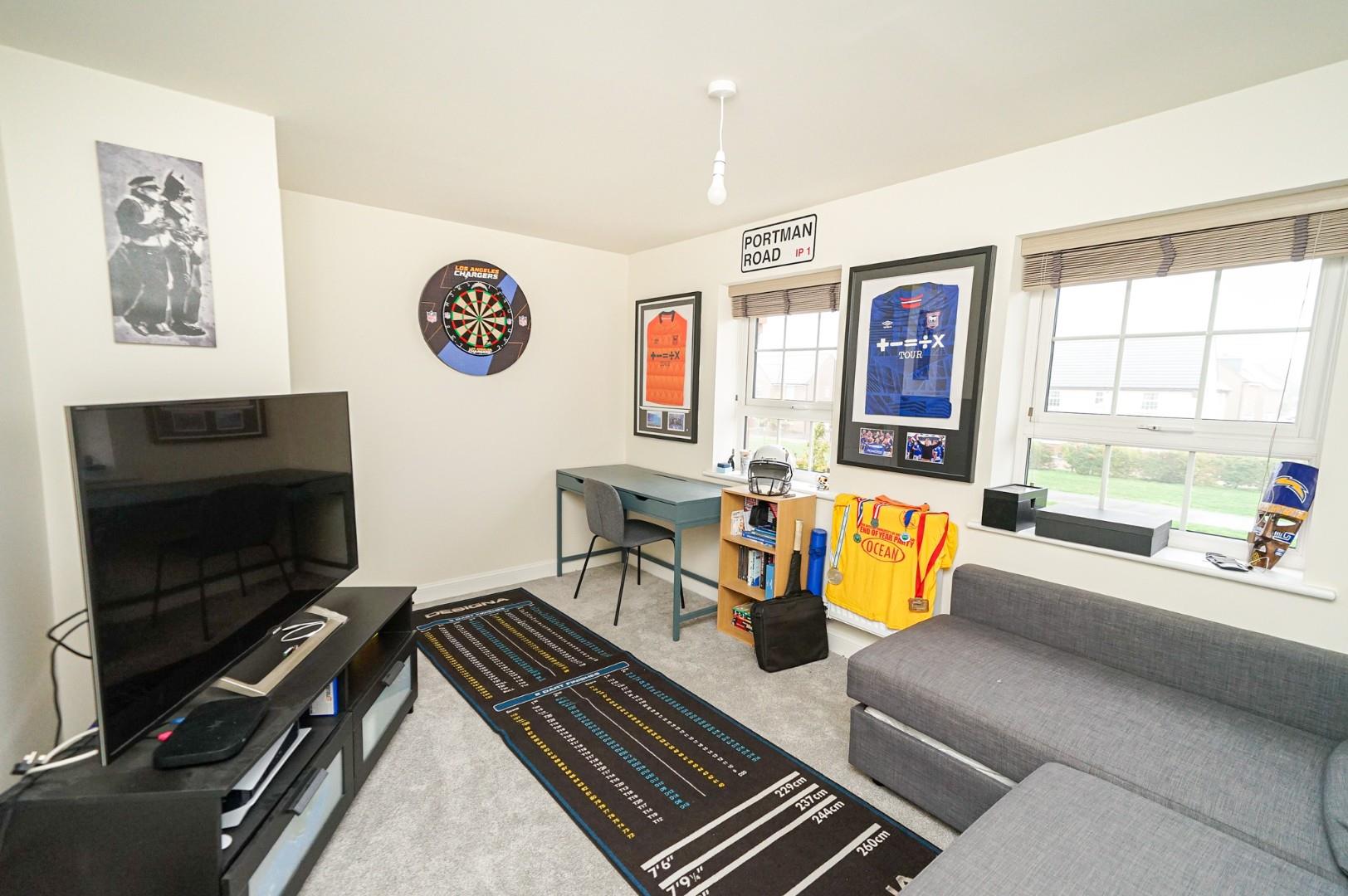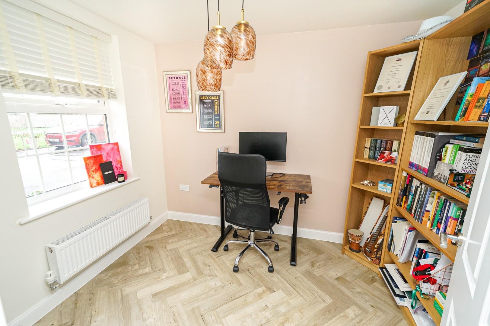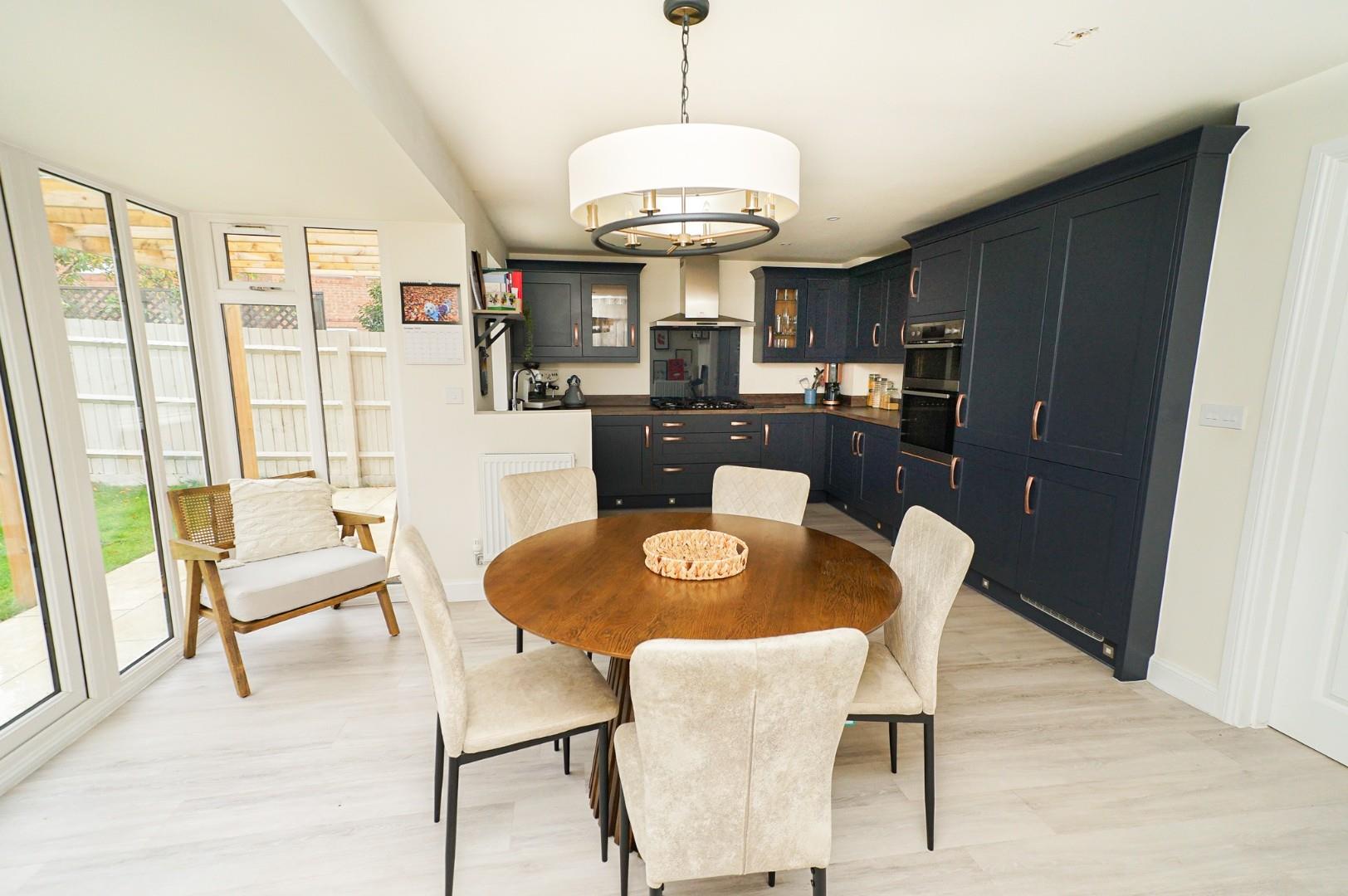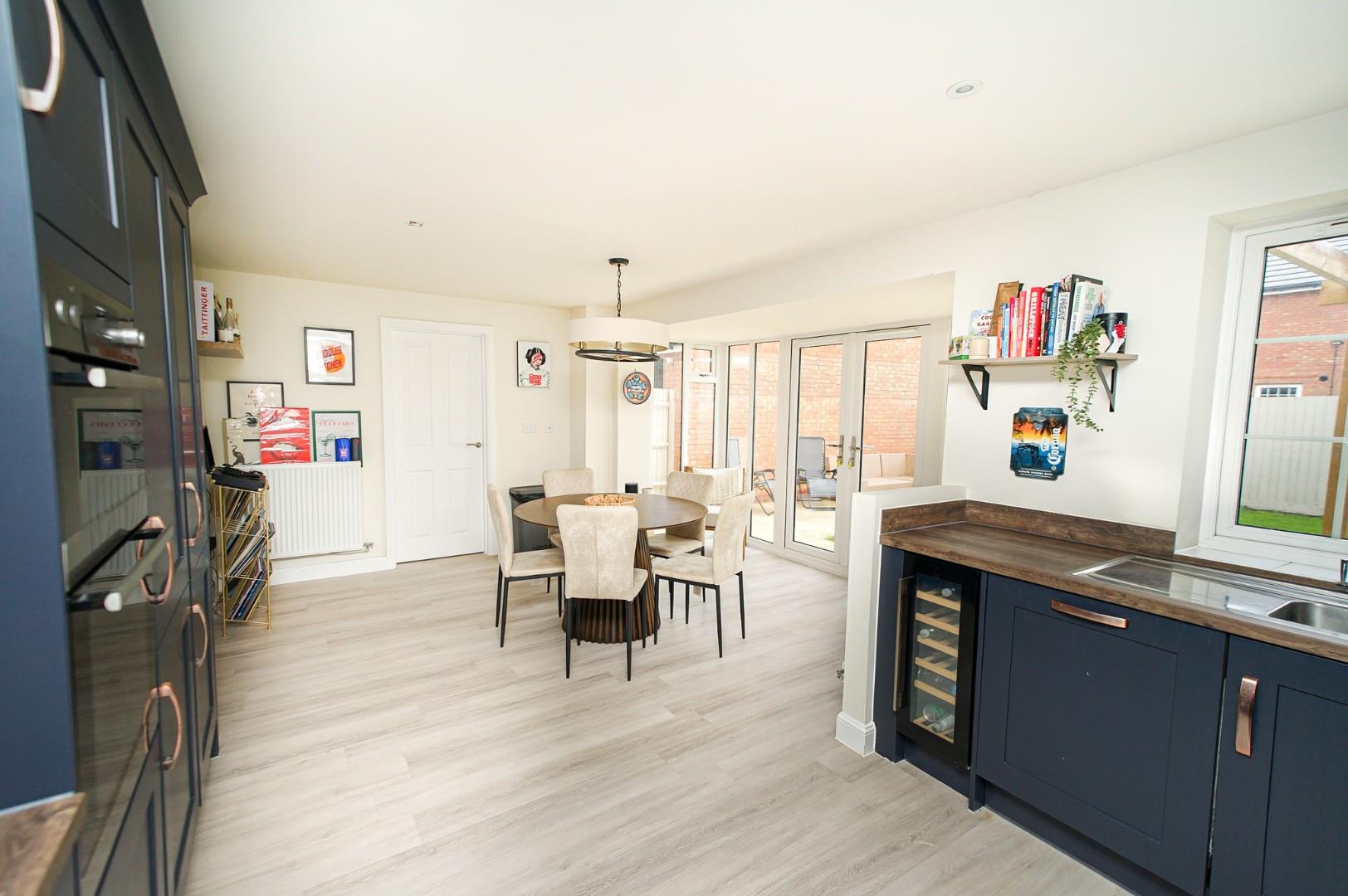 A welcoming and spacious entrance hall sets the tone for this stylish home, finished with upgraded flooring and a contemporary décor that flows throughout. A door leads to a cloakroom/WC which includes a handy understairs storage cupboard, and stairs rise to the first floor. To the front of the property sits the bay-fronted living room, a generous space perfect for both relaxation and entertaining. This inviting room enjoys abundant natural light and easily accommodates a range of furniture arrangements while maintaining a cosy atmosphere. A separate study/home office provides the ideal environment for remote working or a quiet reading retreat. The stunning kitchen/dining/family room forms the social heart of this exceptional home, featuring upgraded fittings and high-spec finishes. The kitchen is fitted with a comprehensive range of modern wall and base level units with premium work surfaces, integrated appliances, and stylish tiled flooring. The adjoining utility room complements the kitchen’s design and includes additional storage, upgraded units, and space for laundry appliances. The dining area comfortably accommodates a family-sized table and enjoys views of the southerly facing garden, with French doors opening onto the patio – perfect for summer dining and entertaining.