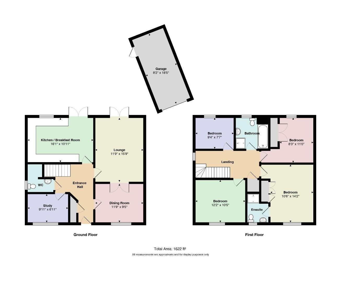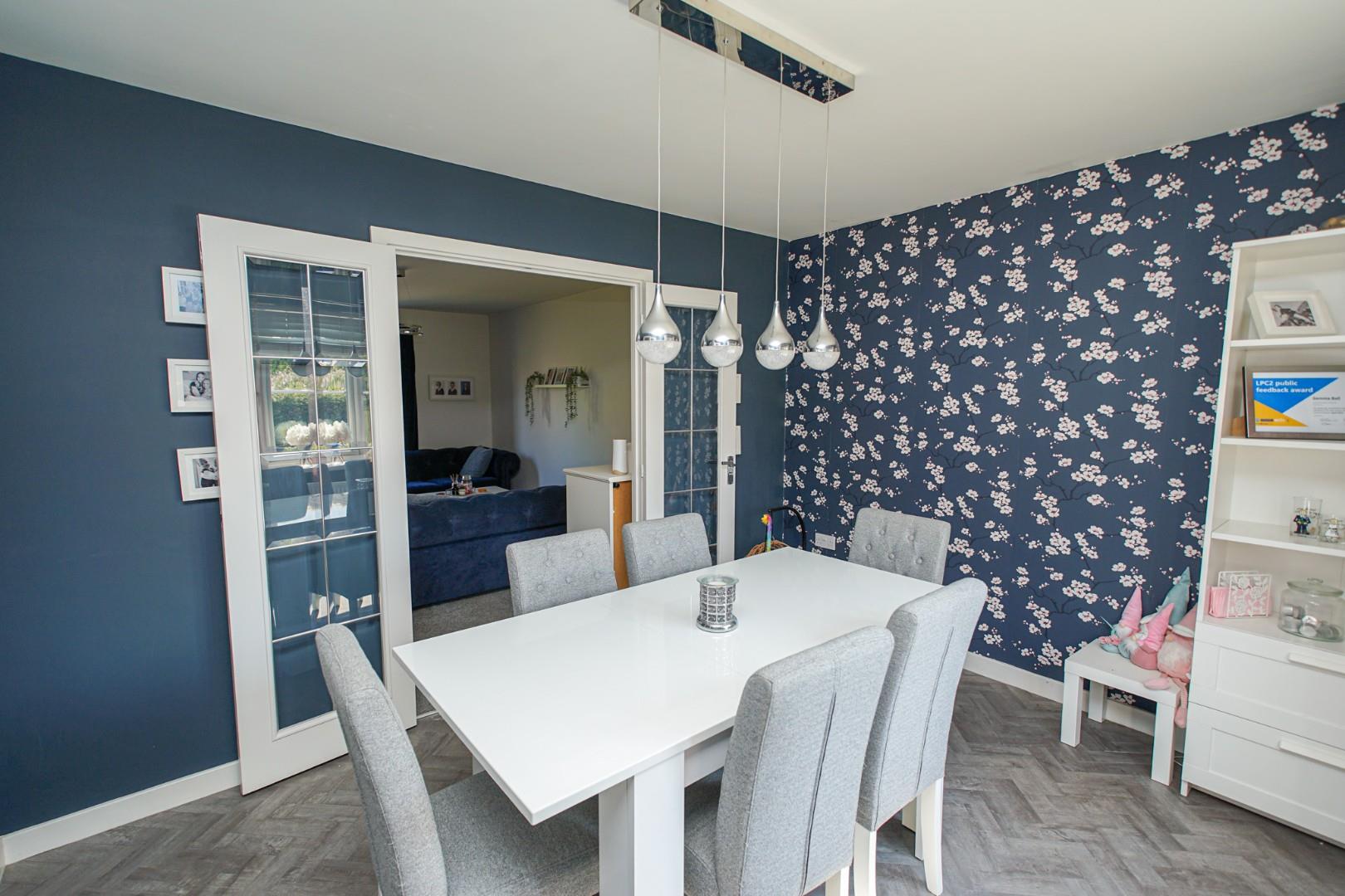 A welcoming central entrance hall sets the tone upon arrival, with stairs rising to the first floor and doors to all ground floor rooms. A useful cloakroom/WC is conveniently positioned off the hallway. To the front of the home is a bright and adaptable study, ideal for home working or quiet reading space, while the formal dining room offers a perfect setting for entertaining or family meals. To the rear, the kitchen/breakfast room enjoys views of the garden and is fitted with a stylish range of units complemented by integrated appliances, including a dishwasher, fridge freezer, washing machine, double oven, and hob with extractor hood. There is ample space for a breakfast table, and French doors open directly to the garden, encouraging indoor/outdoor flow. Adjacent to the kitchen is a generous lounge, also with French doors to the garden, providing an abundance of natural light and a calming view of the landscaped outdoor space.
