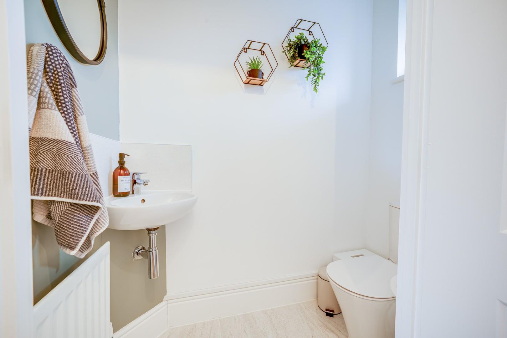 To the rear of the property is a spacious kitchen/dining room which spans the width of the house and provides an excellent social hub. The kitchen is fitted with a modern range of wall and base level units with integrated appliances and generous work surface space. There is ample room for a family sized dining table, and double glazed doors open directly onto the rear patio, allowing natural light to flow through and creating an easy connection between indoor and outdoor living. The ground floor is completed by a cloakroom/WC fitted with a low level WC and wash hand basin.