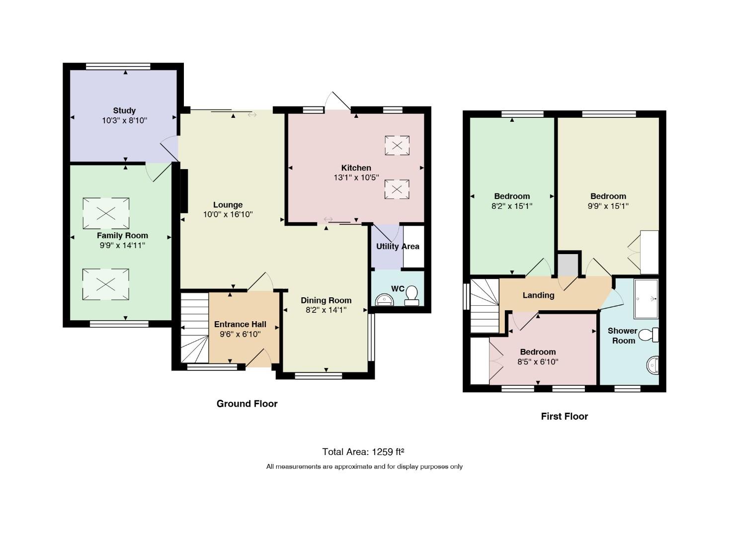 The accommodation begins with an entrance hall providing access to the lounge and stairs rising to the first floor. The lounge is a bright and airy room forming the heart of the home, with ample space for a variety of furniture arrangements. A central fireplace creates a natural focal point, while double glazed sliding doors open directly onto the rear garden, allowing natural light to pour in and providing an easy connection to outdoor living. To the front of the property, the dining room comfortably accommodates a family sized dining table, making it ideal for both everyday meals and entertaining. A door leads through to the kitchen, enhancing the flow of the ground floor layout. The kitchen is fitted with a range of wall and base level units and offers space for a variety of appliances. A courtesy door provides direct access to the garden, particularly practical for family life. Adjacent to the kitchen is a useful utility area with a cloakroom/WC off, adding further convenience. To the rear of the lounge is a well proportioned study, perfectly suited for home working but equally adaptable as a playroom. A door leads through to the generous family room, a versatile additional reception space which could serve as a second sitting room, hobby room or teenager’s retreat depending on requirements.