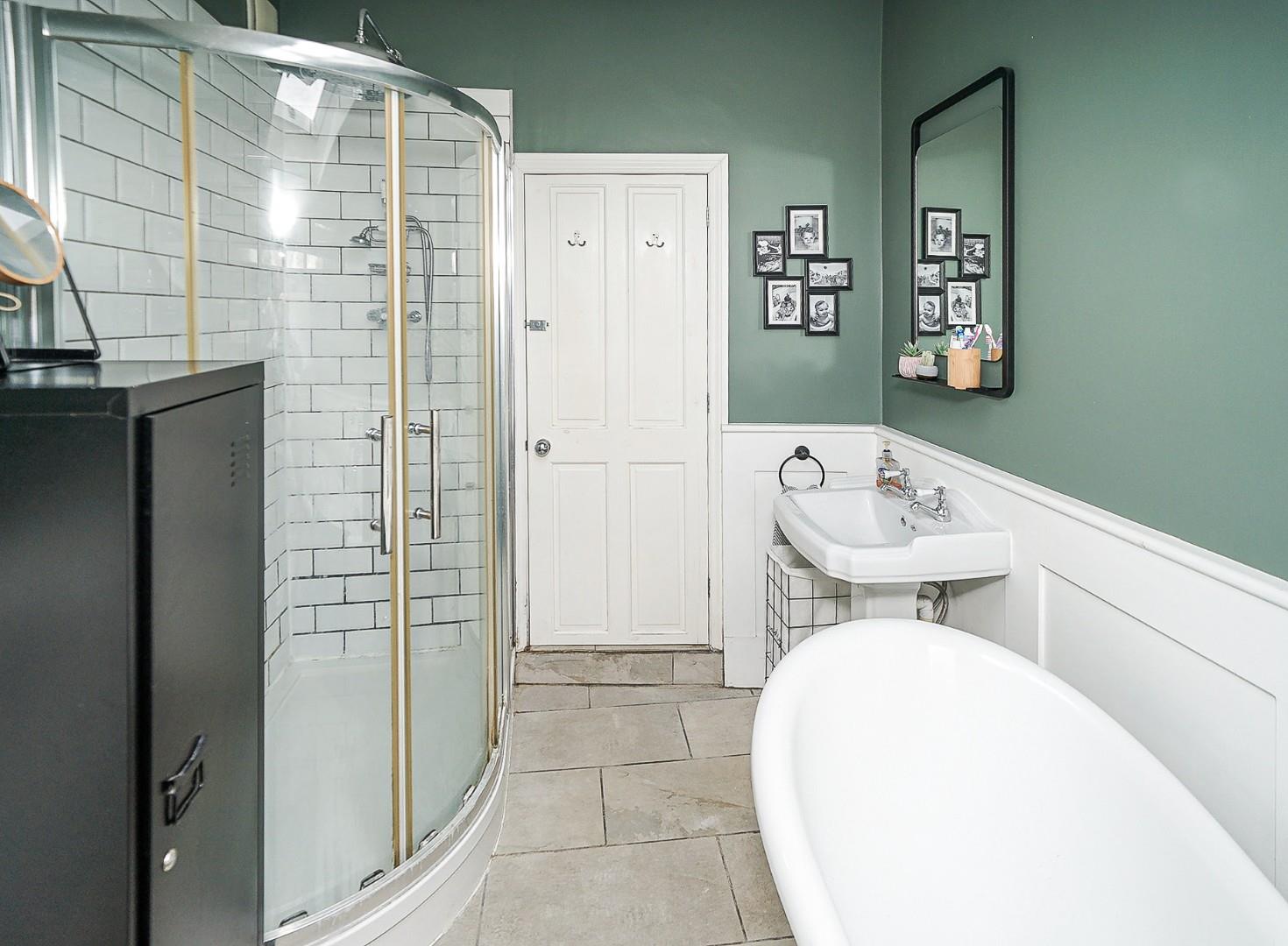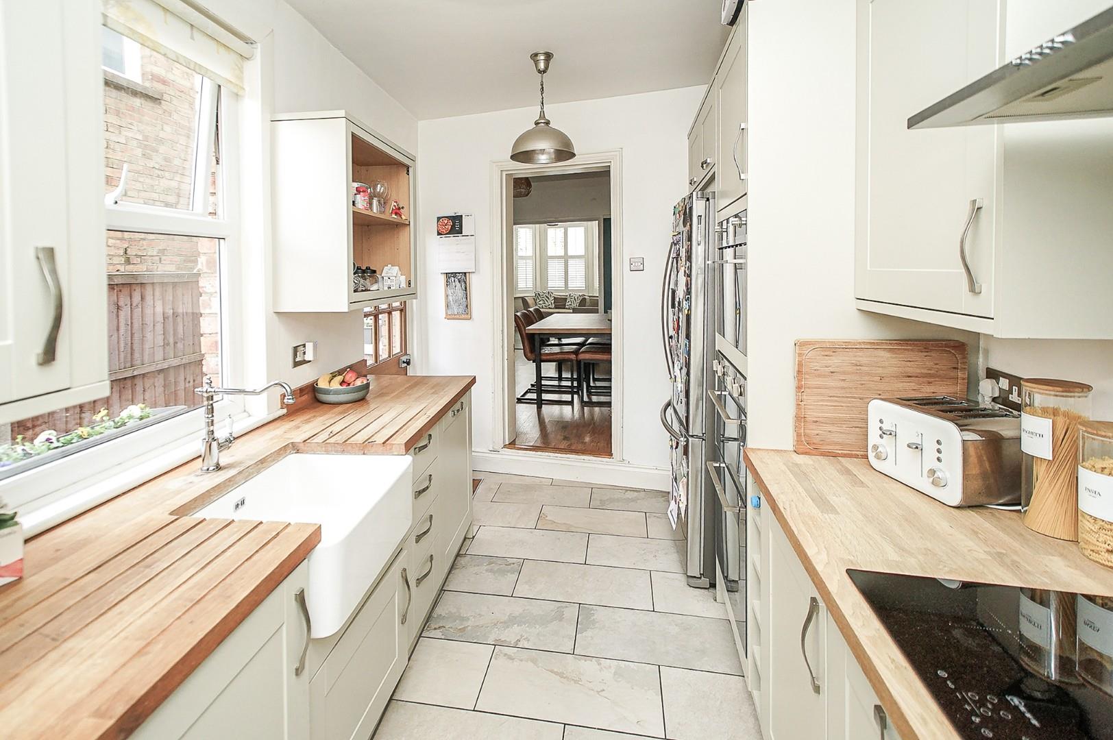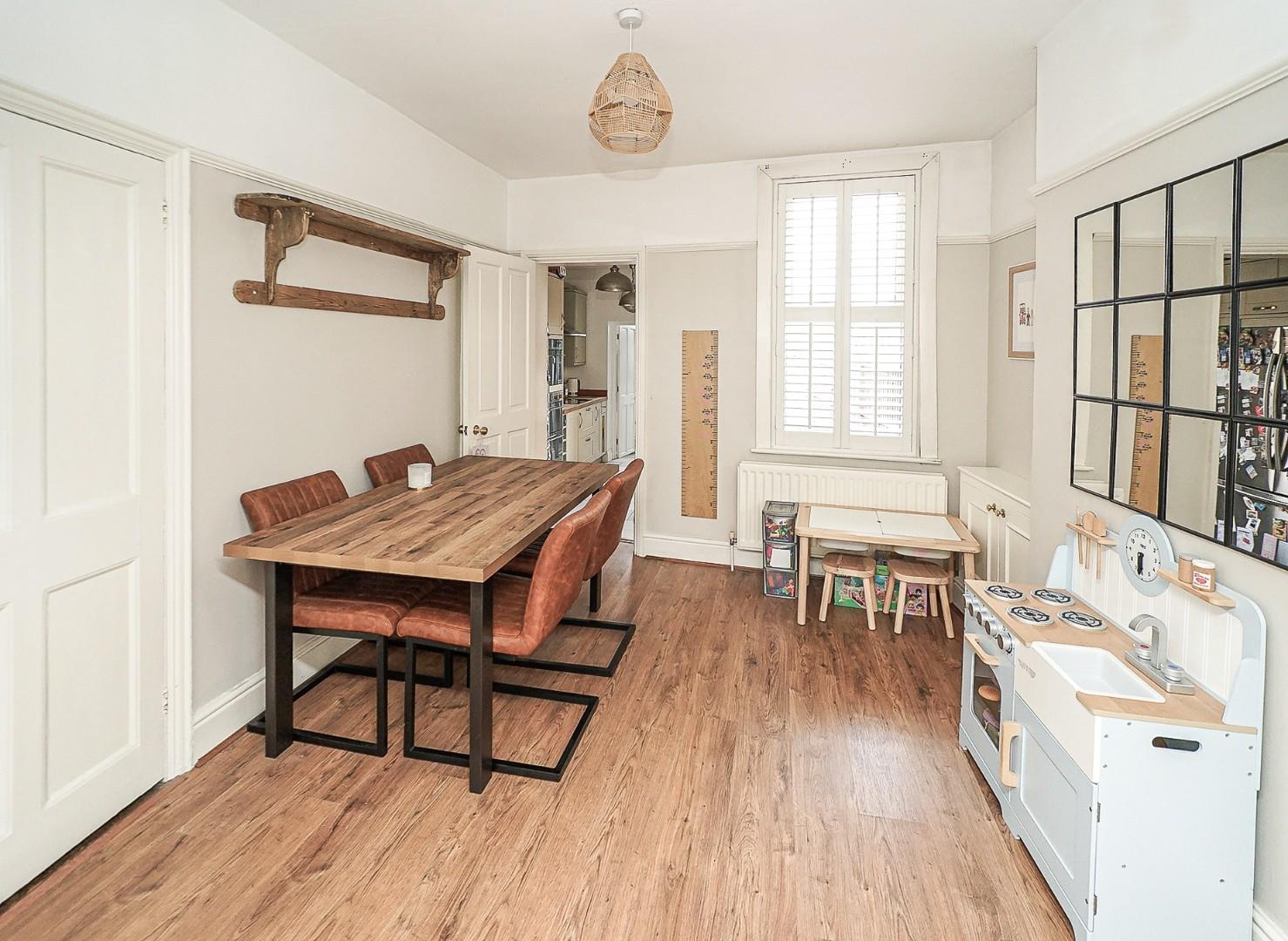 A welcoming entrance hall leads you into the light and airy living accommodation, with a striking tiled floor giving the first insight into the charm of this wonderful family home. The lounge is bright and characterful, featuring a charming fireplace and shutters to the front facing bay window, and flows naturally into the dining area to create a generous open plan feel ideal for modern family life and entertaining. The kitchen has been thoughtfully refitted with oak work surfaces, a butler sink, double oven and plentiful storage, with direct access out to the rear garden. The ground floor also houses a beautifully refitted four-piece bathroom, complete with a separate shower and a skylight that floods the room with natural light. There is underfloor heating to the kitchen and bathroom.