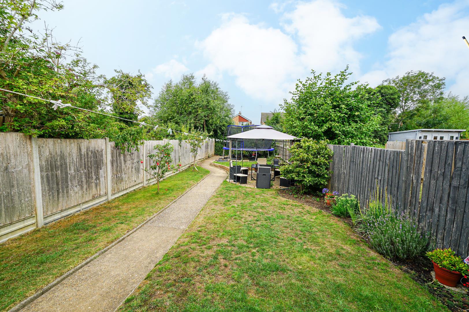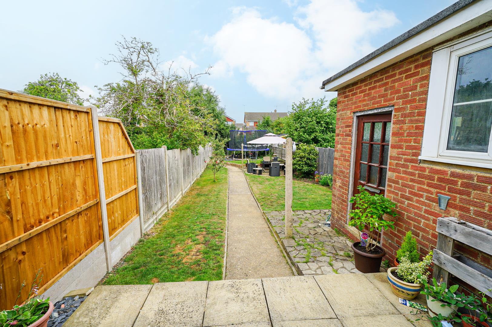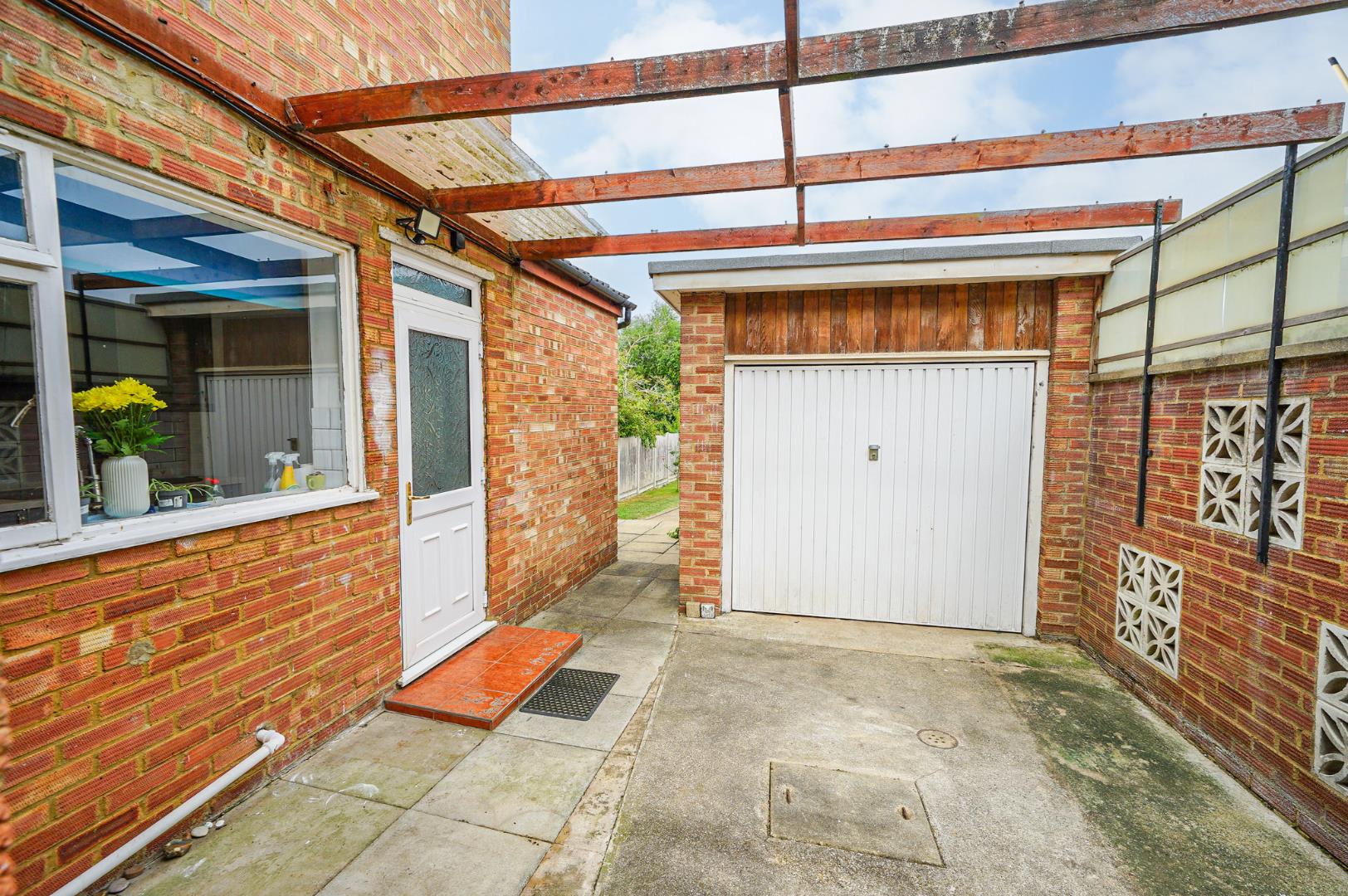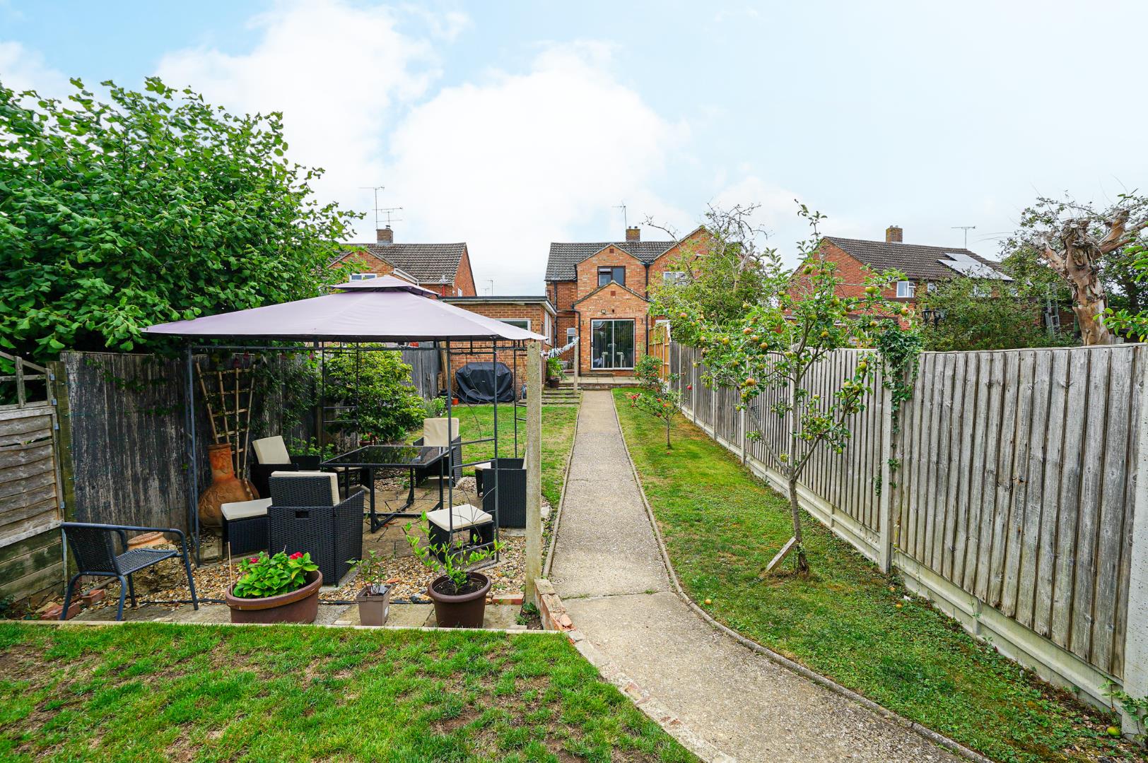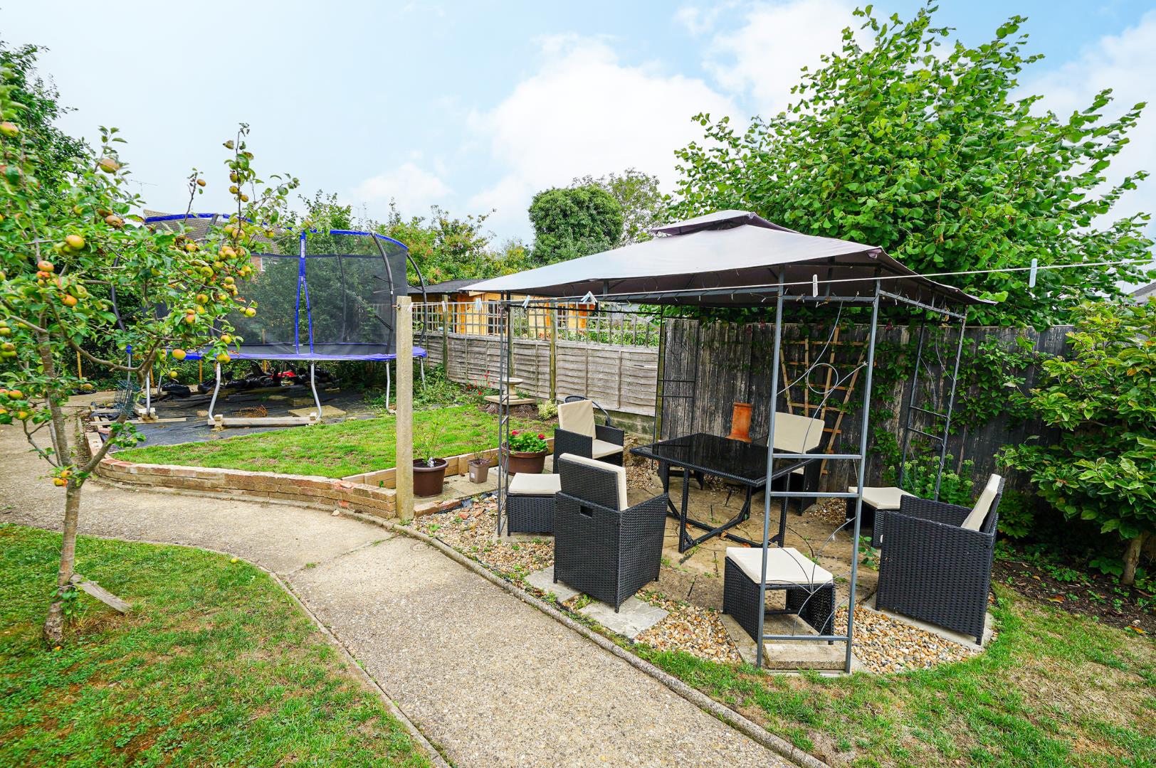 To the front of the property is a generous driveway providing off-road parking for multiple vehicles, with a gated passage to the side offering access to the garage, which is fitted with an up and over door. At the rear of the garage is a separate store, ideal for garden equipment or workshop use. The rear garden is a real highlight, offering a spacious lawn, two paved patio areas, and a selection of fruit trees and mature shrubbery which combine to create a private and well-stocked outdoor retreat.