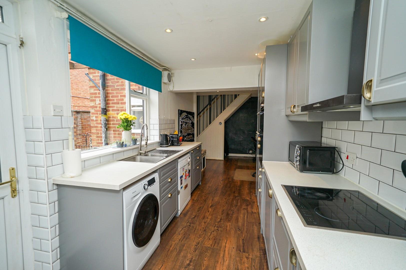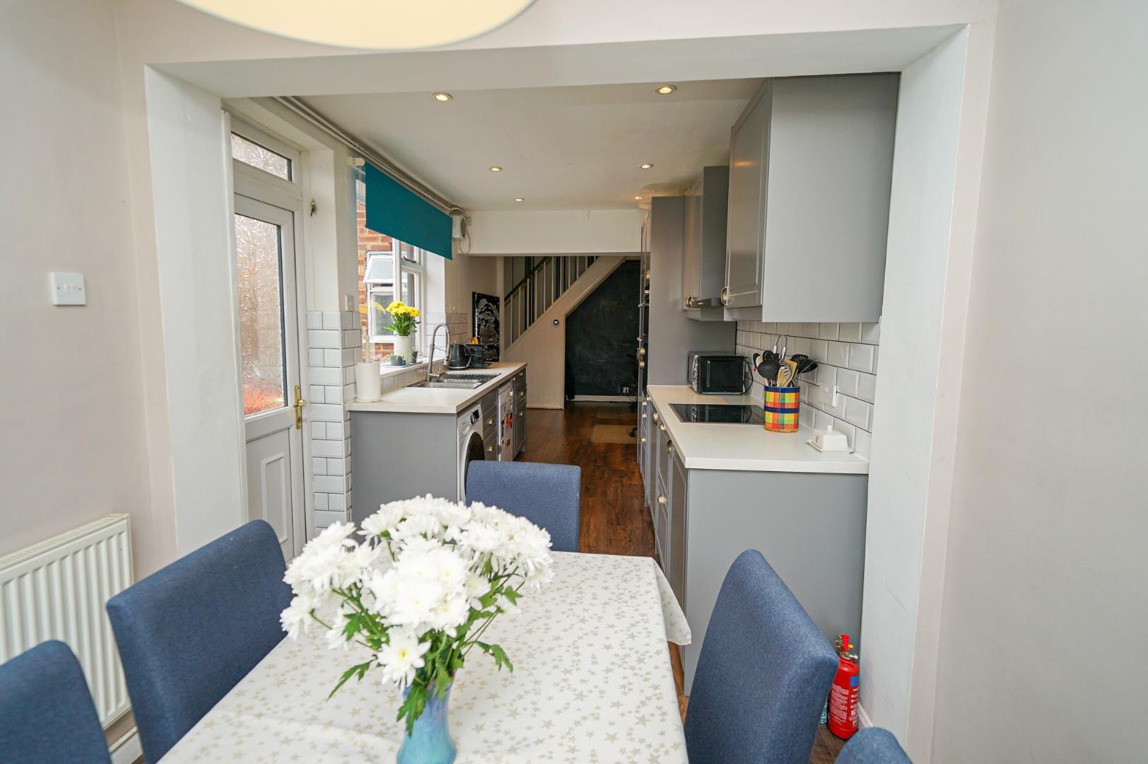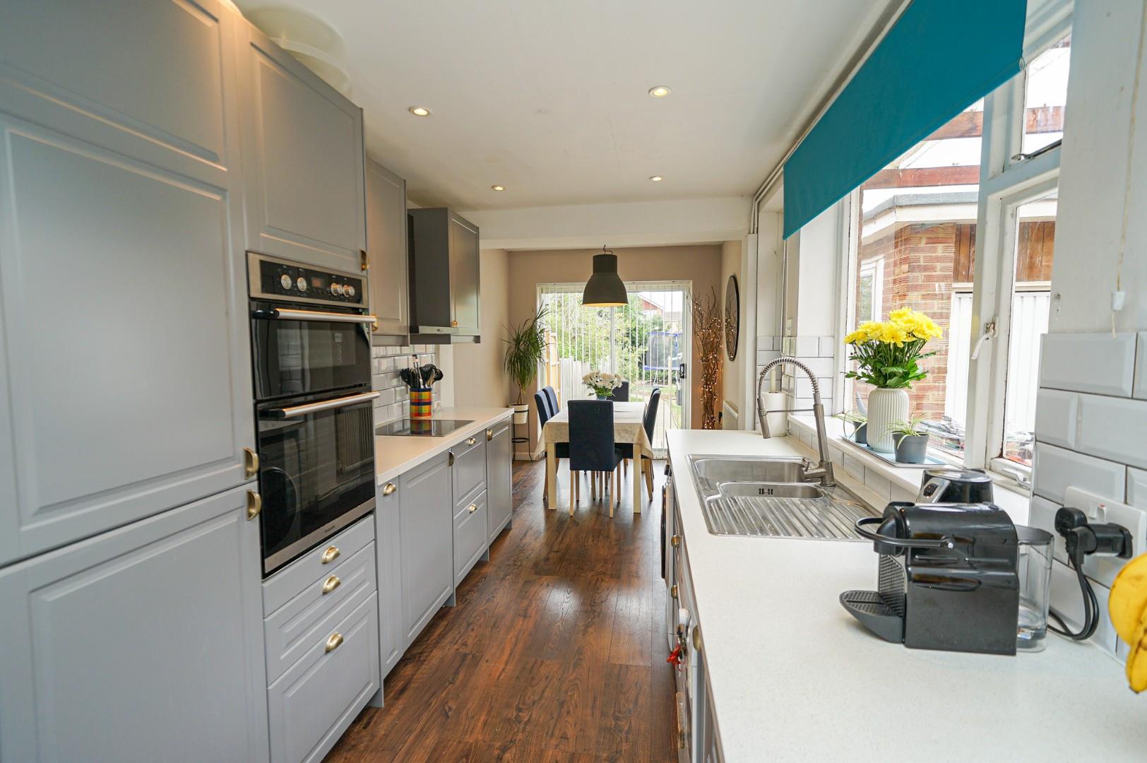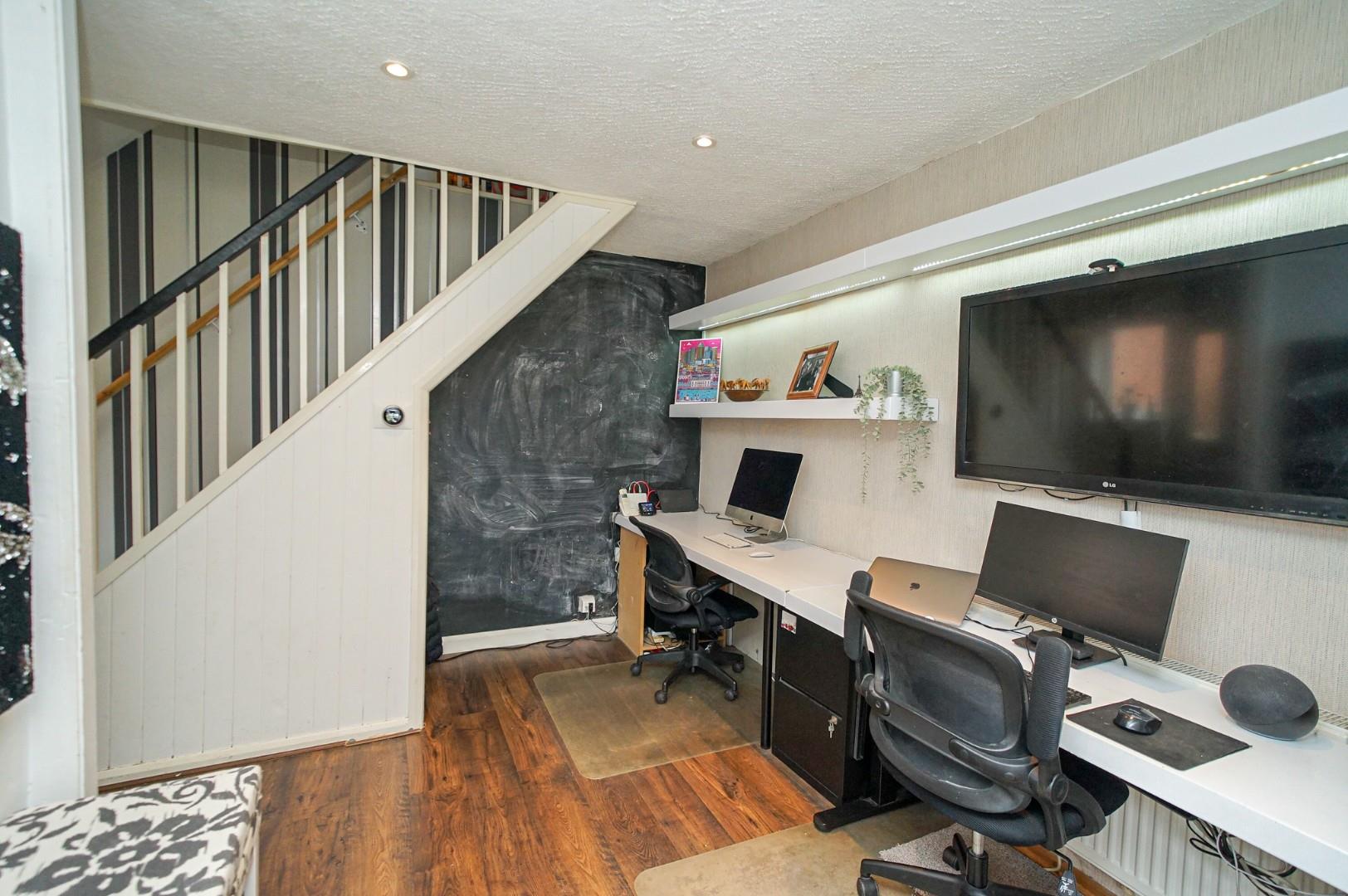 The property is entered via a centrally positioned side door which opens into a welcoming hallway. To the front is a bright and spacious extended lounge, ideal for entertaining or relaxing. Opposite the entrance is a ground floor shower room, offering added convenience for families or guests. Ahead, the hallway opens into a generous open plan kitchen/dining/family room, offering superb flexibility of use. The kitchen area is fitted with a range of wall and base level units with work surfaces over and includes integrated appliances such as a fridge freezer, double oven, and hob with hood, alongside spaces for a washing machine and dishwasher. One end of the room is currently used as a study area, while the other end provides a generous dining space with sliding doors opening onto the rear garden. A courtesy door also leads to the side of the property.