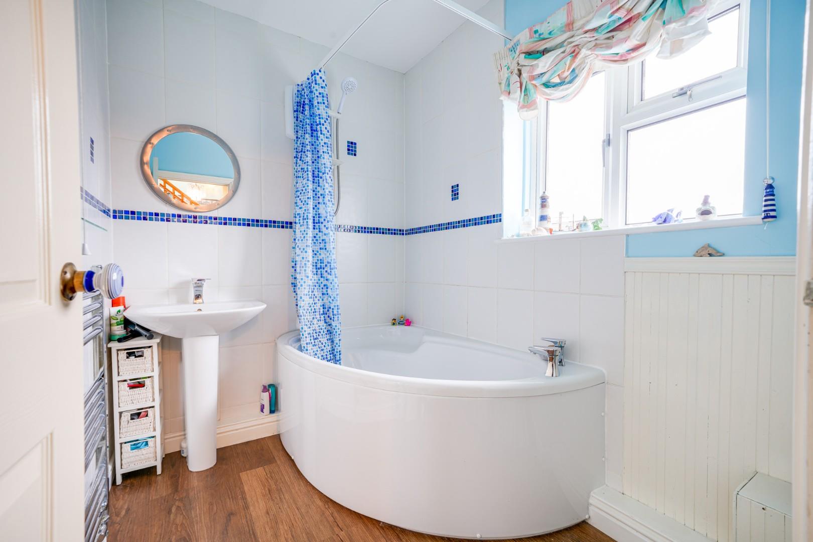 The landing provides access to three bedrooms and the family bathroom, with stairs continuing to the loft extension. The main bedroom is a generous double facing the rear aspect with ample space for bedroom furniture. An ensuite shower room features a modern three-piece suite including walk-in shower, vanity wash hand basin with built-in storage, and low-level WC. A further rear-facing double bedroom features a built-in storage cupboard and overlooks the garden with ample space for a range of bedroom furniture. A further bedroom to the front aspect offers good proportions, suitable as a children's bedroom or guest room. The family bathroom is fitted with a three-piece suite comprising low-level WC, pedestal wash hand basin and oval-shaped bath, with tiling to water-sensitive areas.