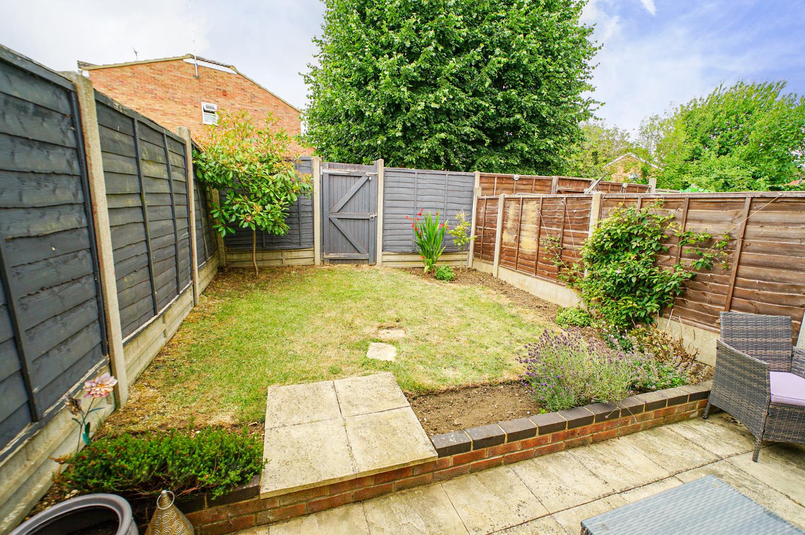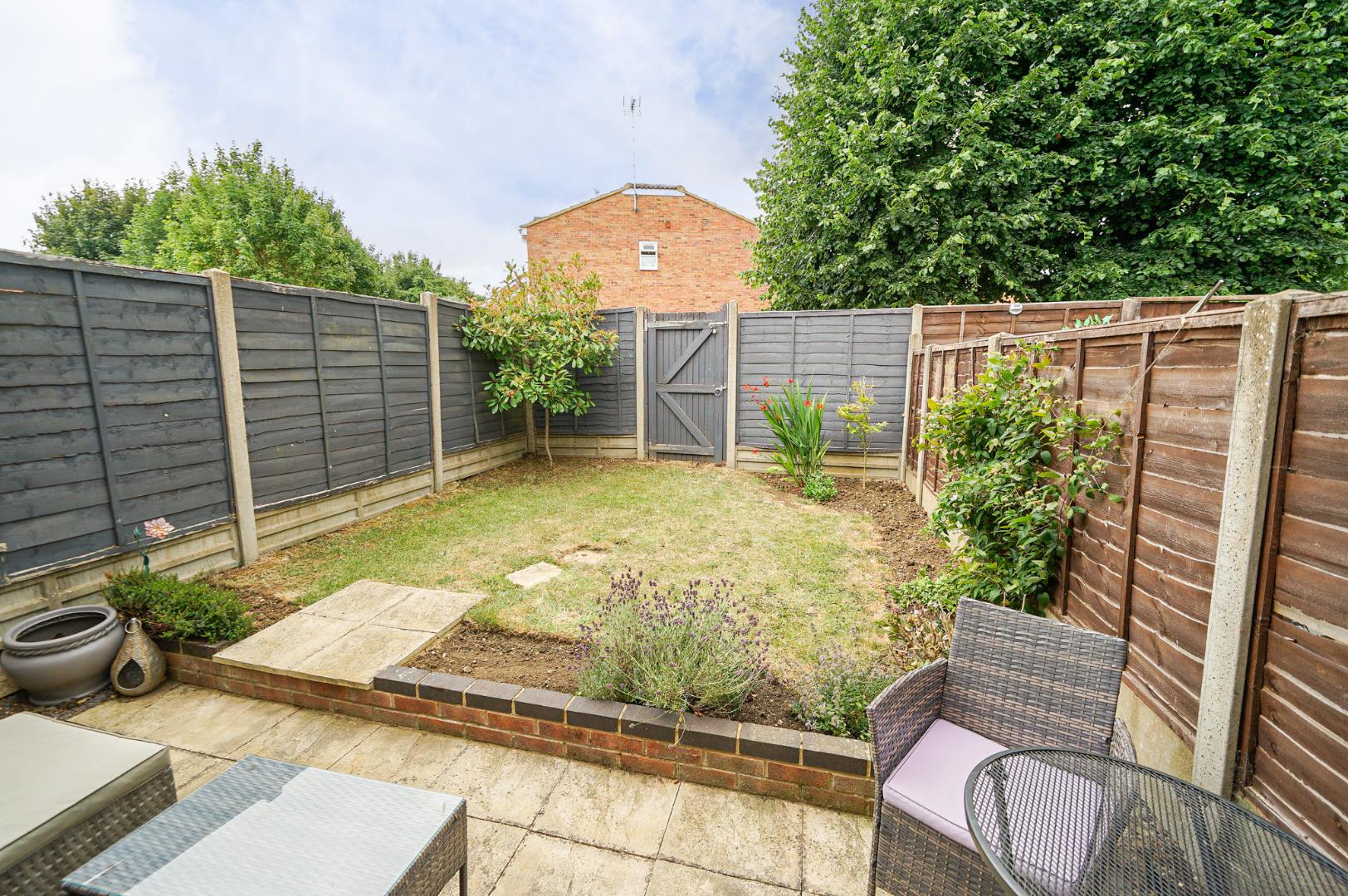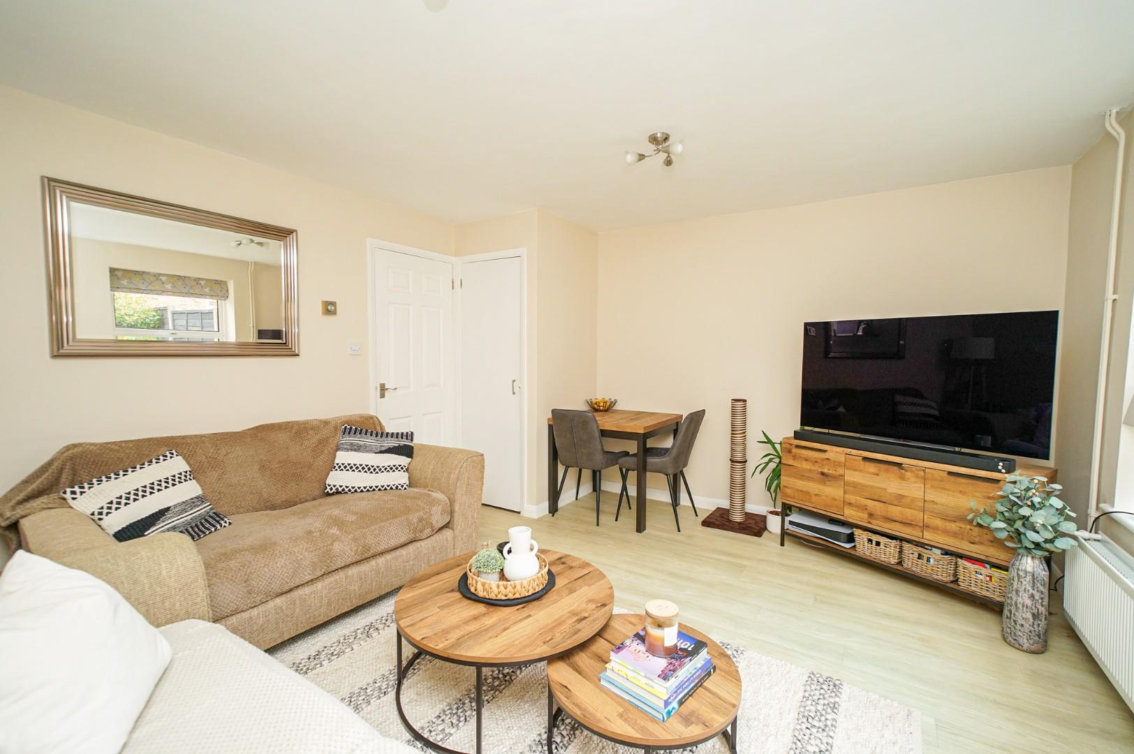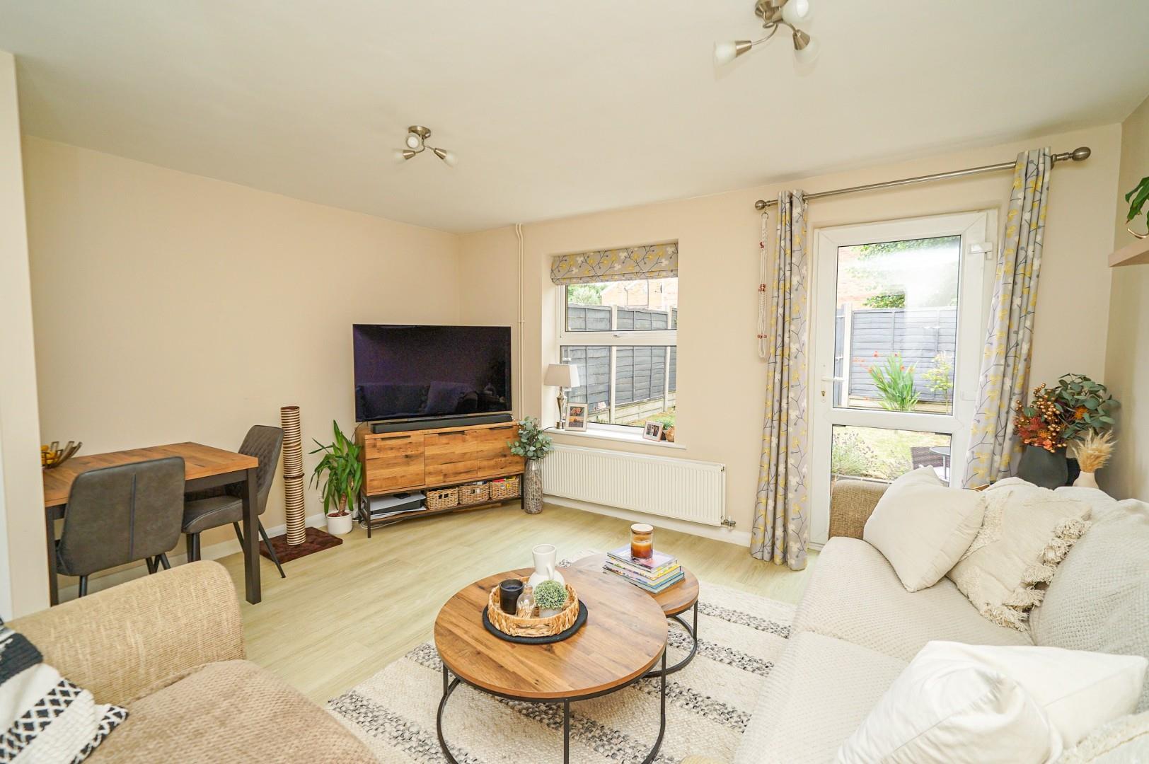 Externally, the front garden is neatly presented with a lawn and pathway to the front door. The rear garden is west-facing and offers a private and sunny retreat with a paved patio area, a well-kept lawn, and neatly maintained shrub borders. A rear access gate opens onto a footpath and nearby green space, ideal for those who enjoy walking or need easy rear access. The property further benefits from a garage located nearby, with a driveway providing off-road parking in front.