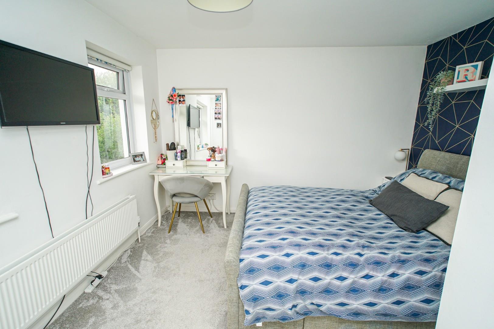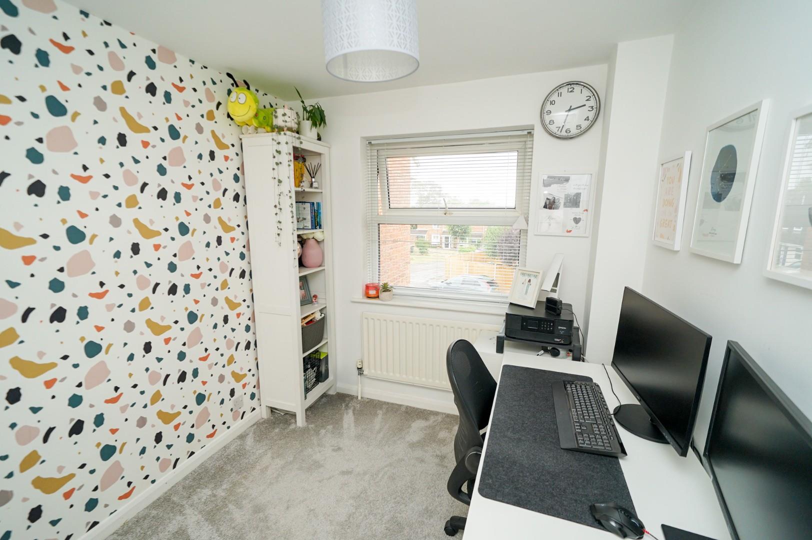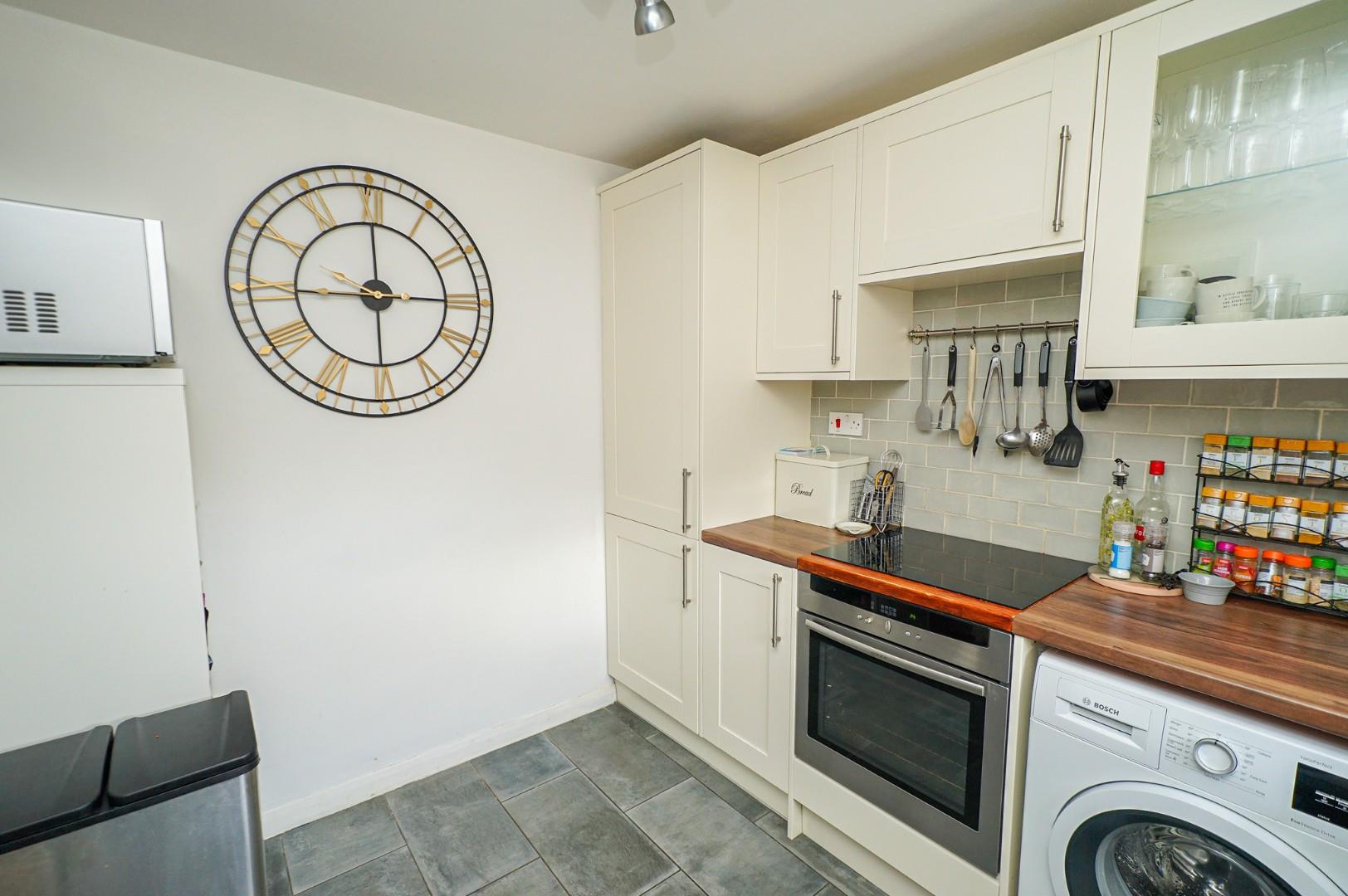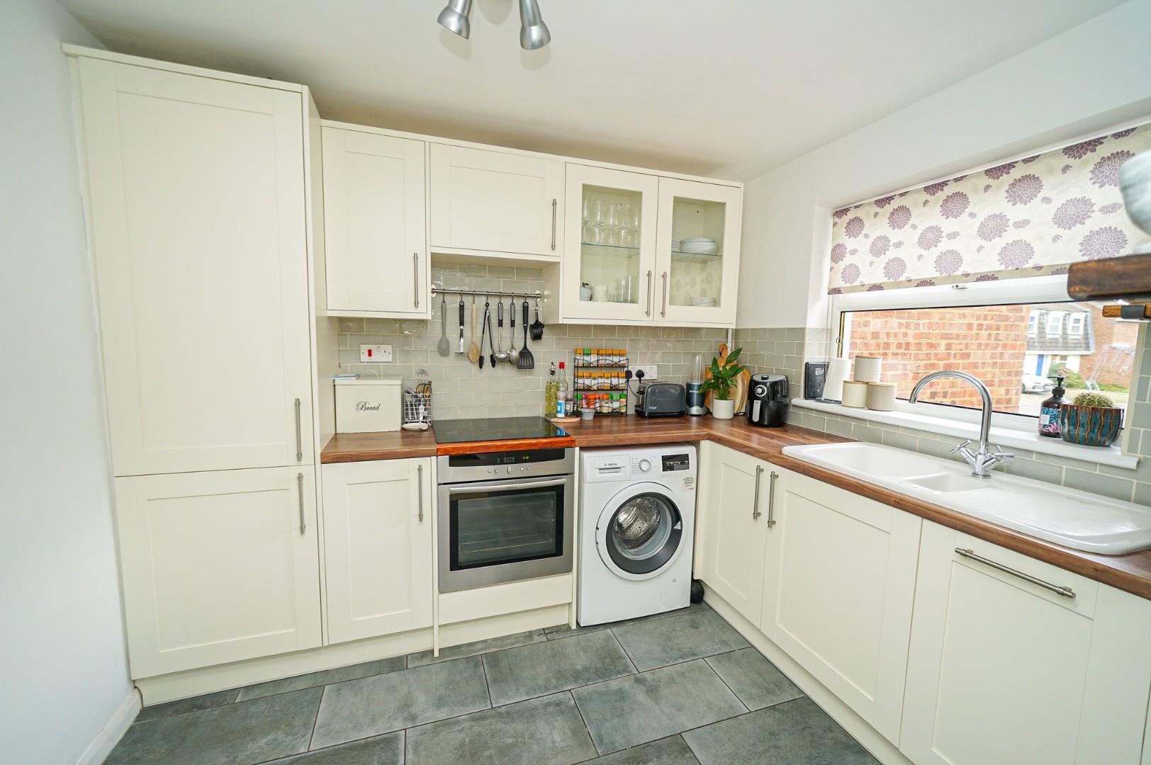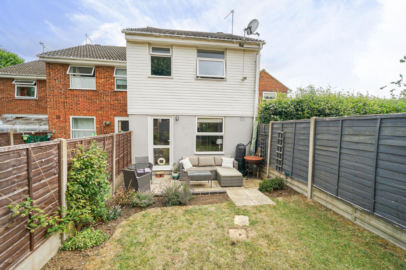 Externally, the front garden is neatly presented with a lawn and pathway to the front door. The rear garden is west-facing and offers a private and sunny retreat with a paved patio area, a well-kept lawn, and neatly maintained shrub borders. A rear access gate opens onto a footpath and nearby green space, ideal for those who enjoy walking or need easy rear access. The property further benefits from a garage located nearby, with a driveway providing off-road parking in front.
