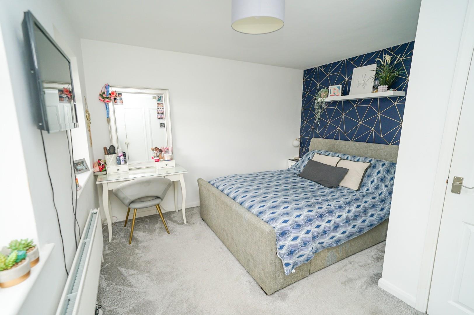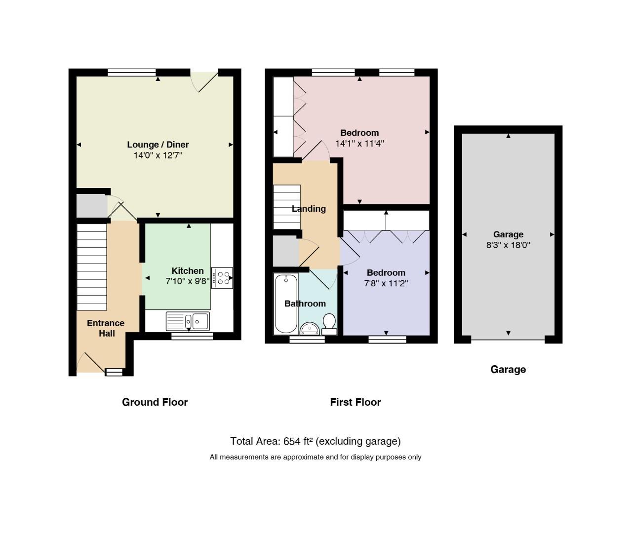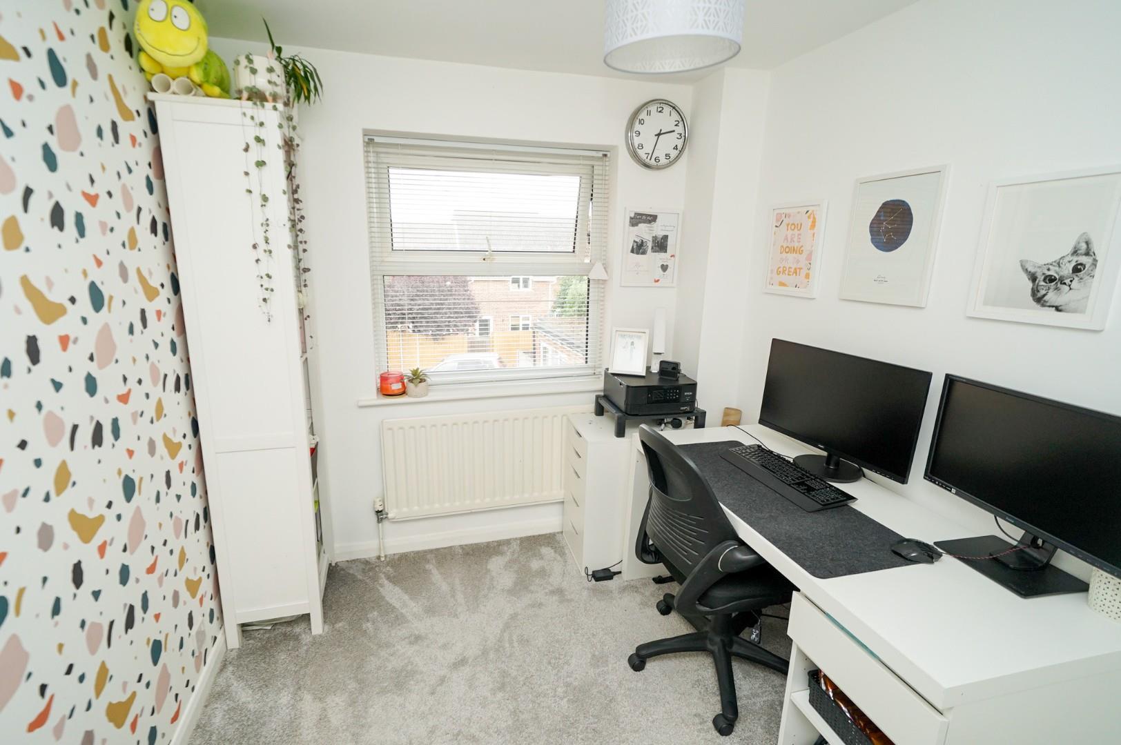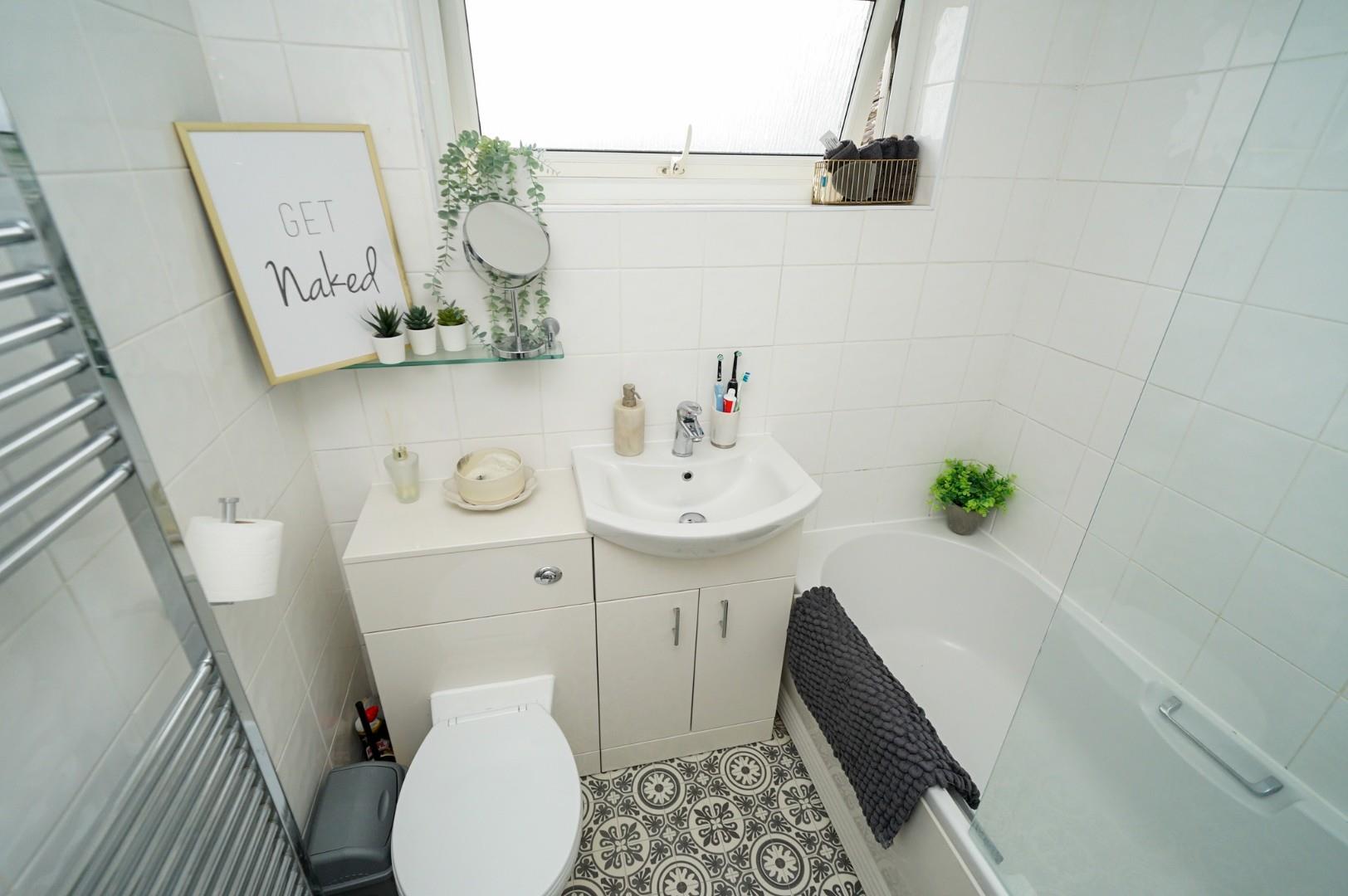 Externally, the front garden is neatly presented with a lawn and pathway to the front door. The rear garden is west-facing and offers a private and sunny retreat with a paved patio area, a well-kept lawn, and neatly maintained shrub borders. A rear access gate opens onto a footpath and nearby green space, ideal for those who enjoy walking or need easy rear access. The property further benefits from a garage located nearby, with a driveway providing off-road parking in front.